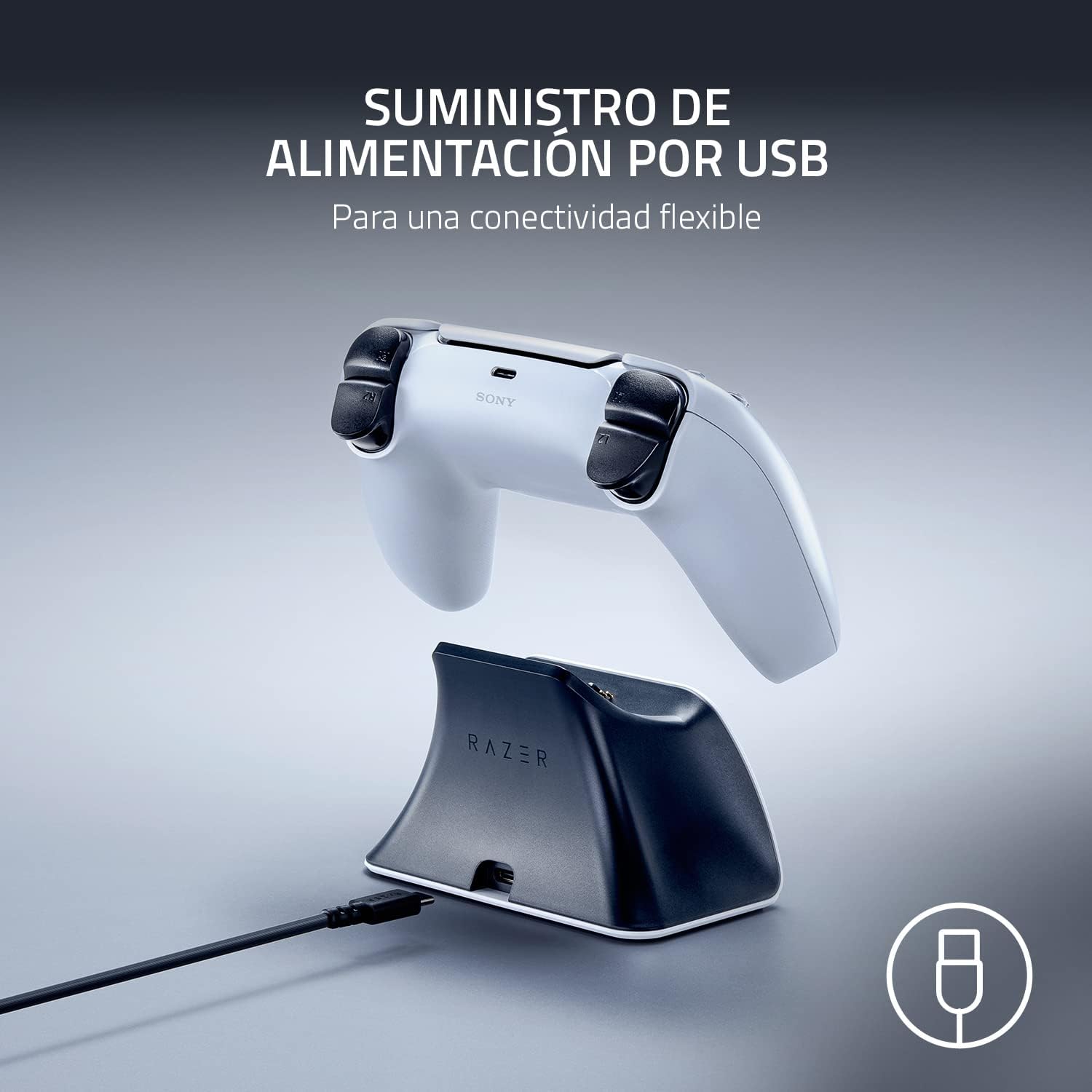 Alimentado por USB: Simplemente conecte el soporte de carga a una consola PS5, PC o enchufes de pared compatibles (se venden por separado) para encenderse y comenzar a cargar