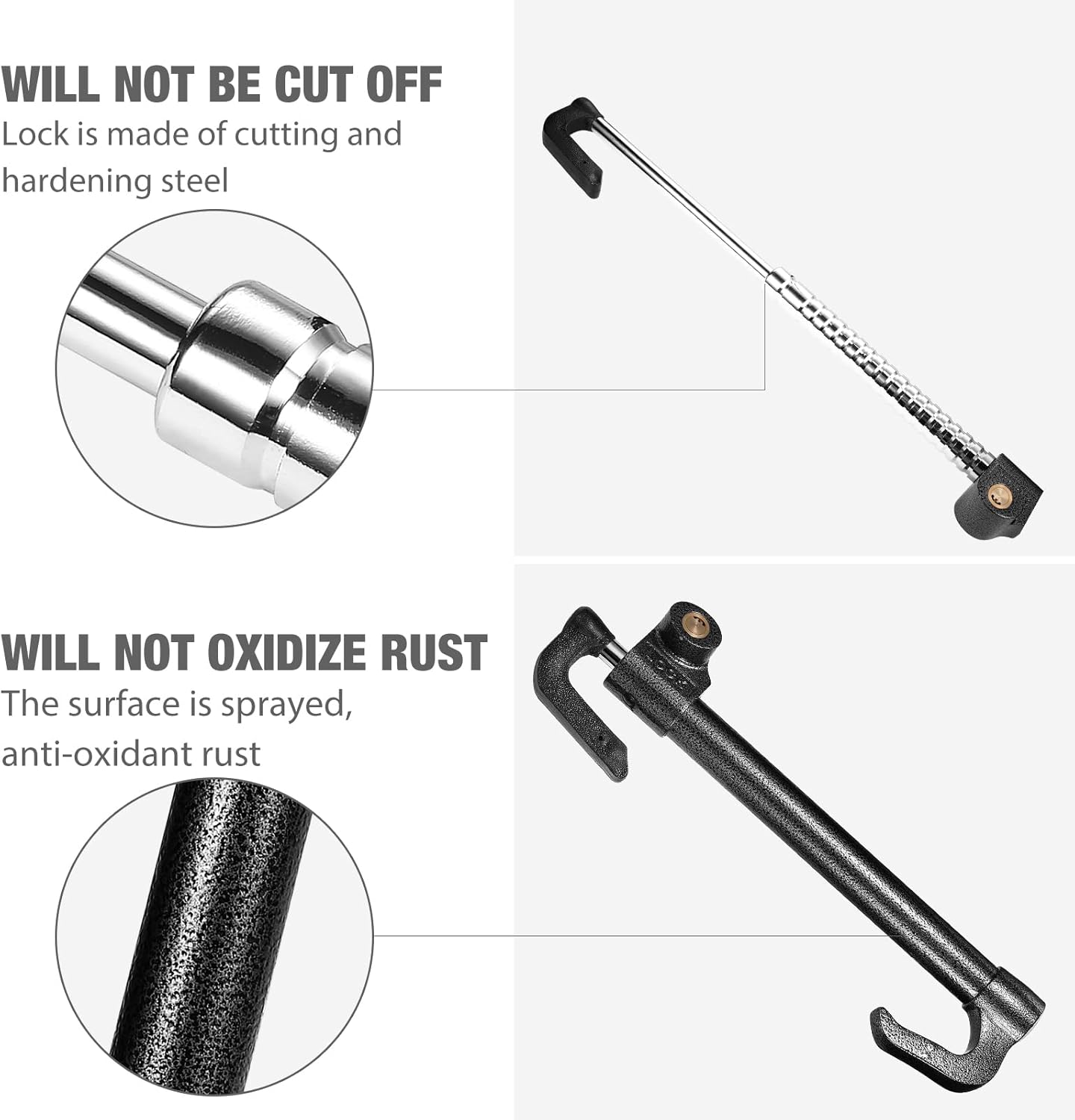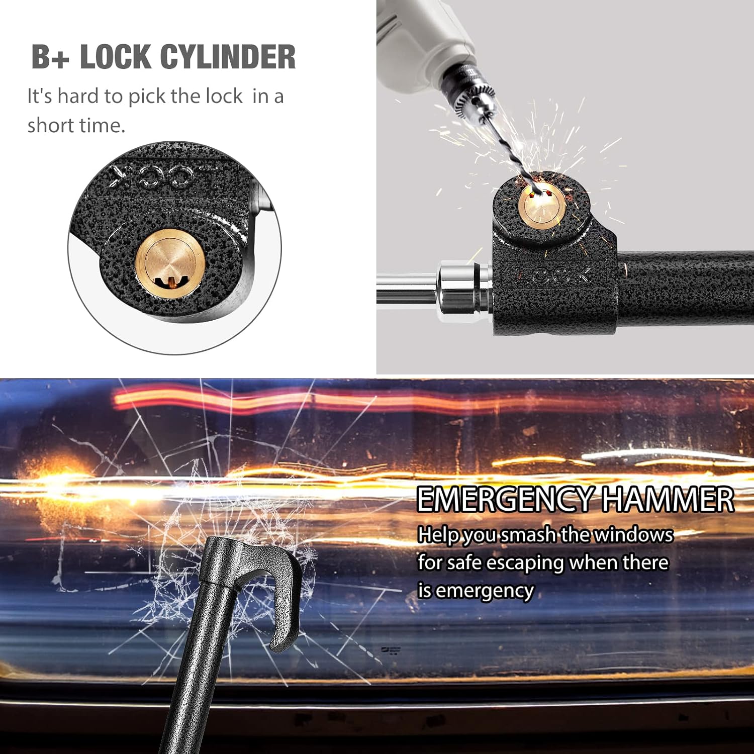 Se instala y saca en solo 5 segundos ajustandose a la perfeccion hasta los 85 centimetros de largo para bloquear el freno por completo Ademas incluye tres llaves unicas con un sistema que no se puede copiar para que duermas verdaderamente tranquilo Y como si fuera poco su estructura de acero macizo te sirve como martillo de seguridad para romper el vidrio en caso de cualquier emergencia