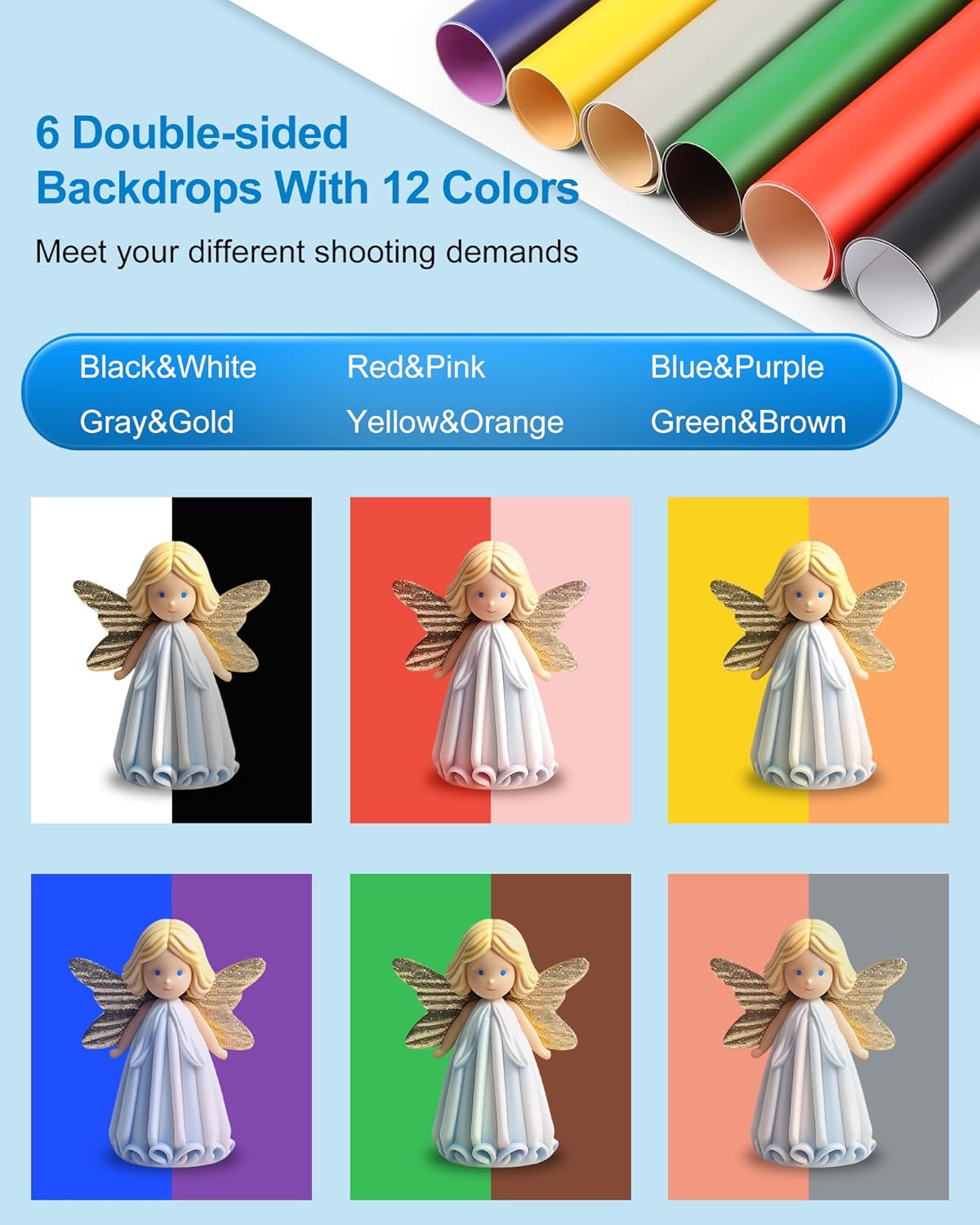 Versatilidad de Fondos Incluye 6 tipos de fondos de color de doble cara, permitiéndote cambiar la estética de tus fotos en segundos para adaptarlas a la identidad de tu marca o al estilo del producto.