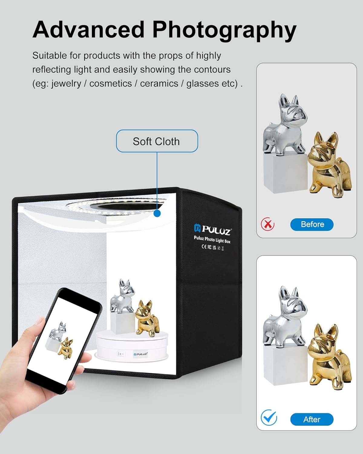 Lleva la fotografía de tus productos al siguiente nivel con esta caja de luz profesional. Diseñada para emprendedores, artistas y vendedores online que necesitan imágenes de alta calidad sin complicaciones. Es la solución perfecta para fotografiar joyas, accesorios, juguetes, relojes y gadgets con acabado de estudio.