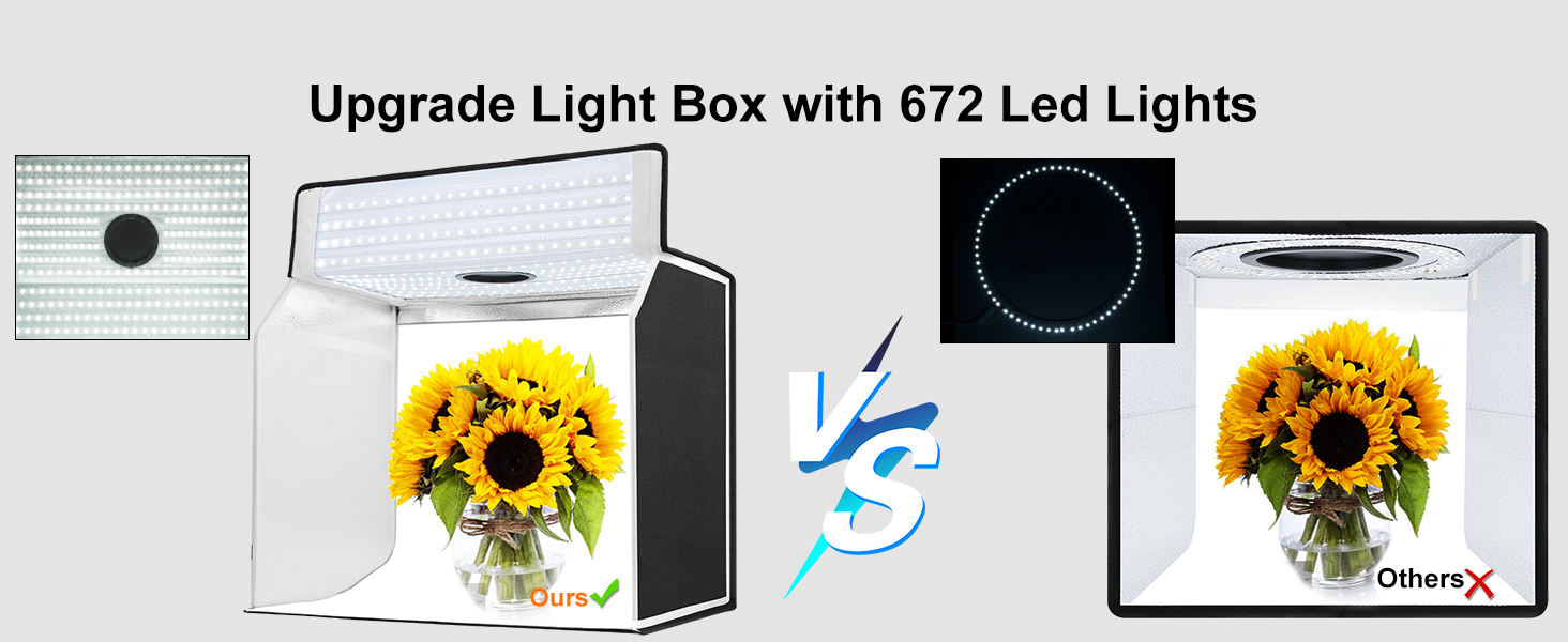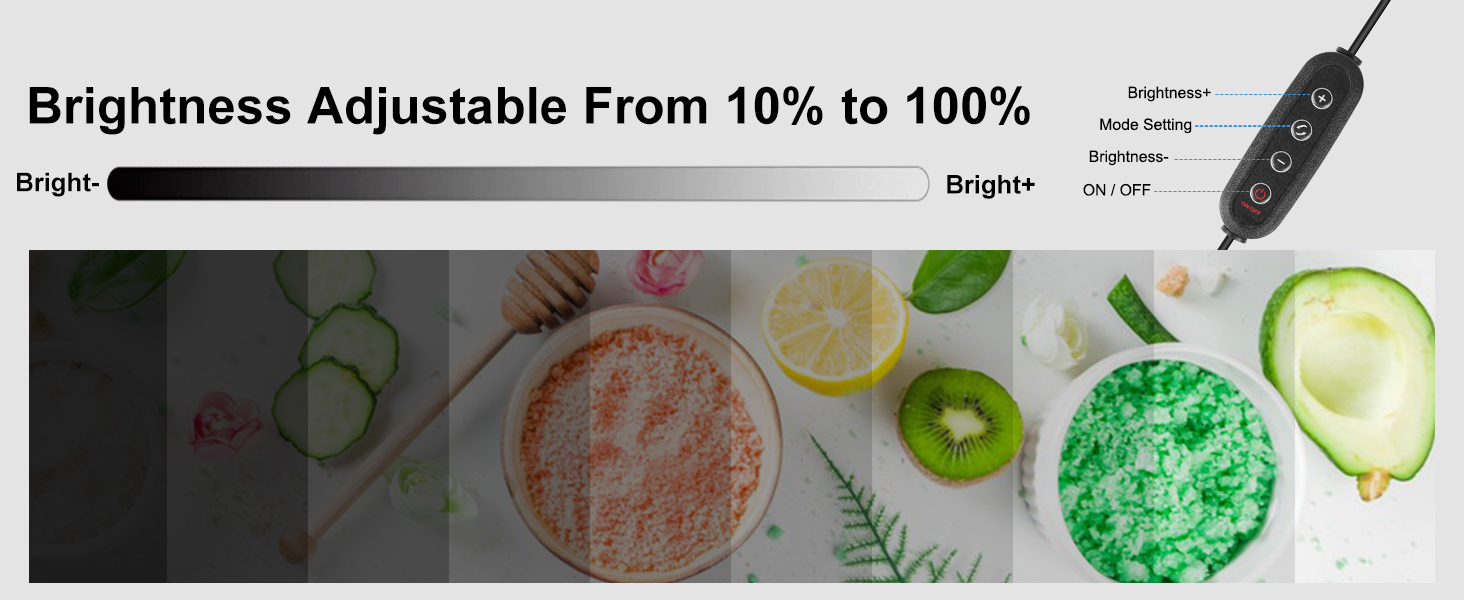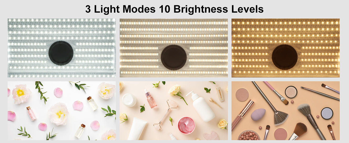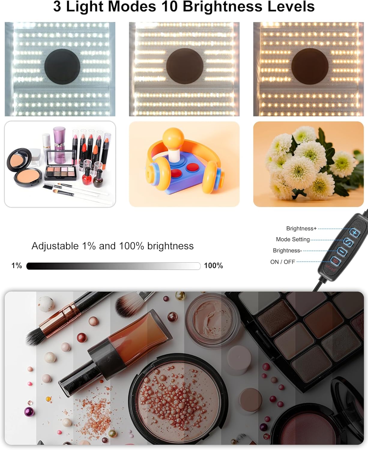 Equipada con 320 luces LED de alta calidad (160 frías y 160 cálidas). Cuenta con un dimmer que te permite regular la intensidad del brillo del 1% al 100% y ajustar la temperatura de color entre 3200K (cálido) y 6500K (frío). Esto garantiza que los colores de tus productos se vean reales (CRI >95).