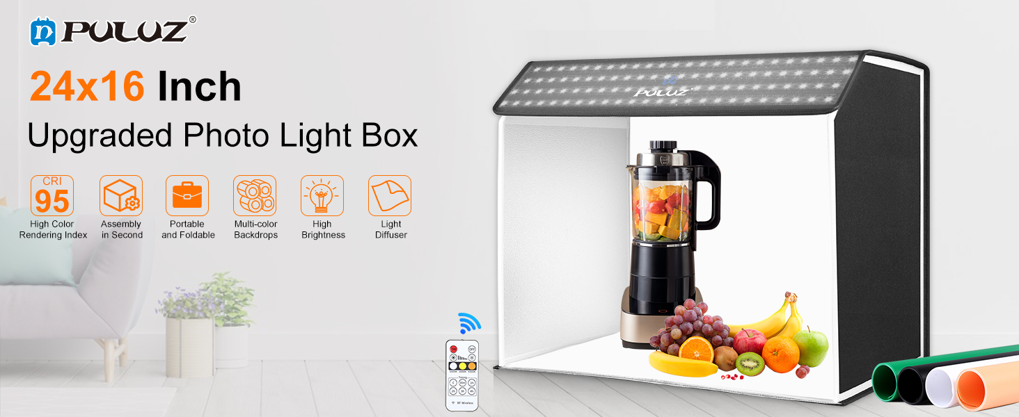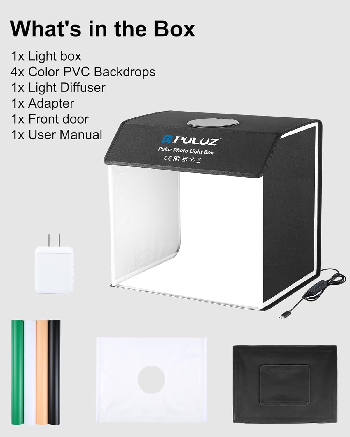 1 Caja de luz principal (selecciona tu medida: 40cm o 60cm), 1 Panel de iluminación LED circular, 4 Fondos de PVC (Blanco, Negro, Naranjo, Verde), 1 Difusor de luz suave, 1 Fuente de alimentación con regulador y 1 Bolsa de transporte.