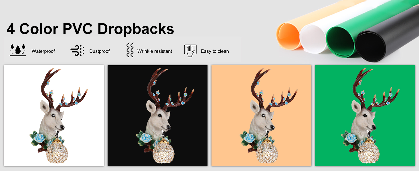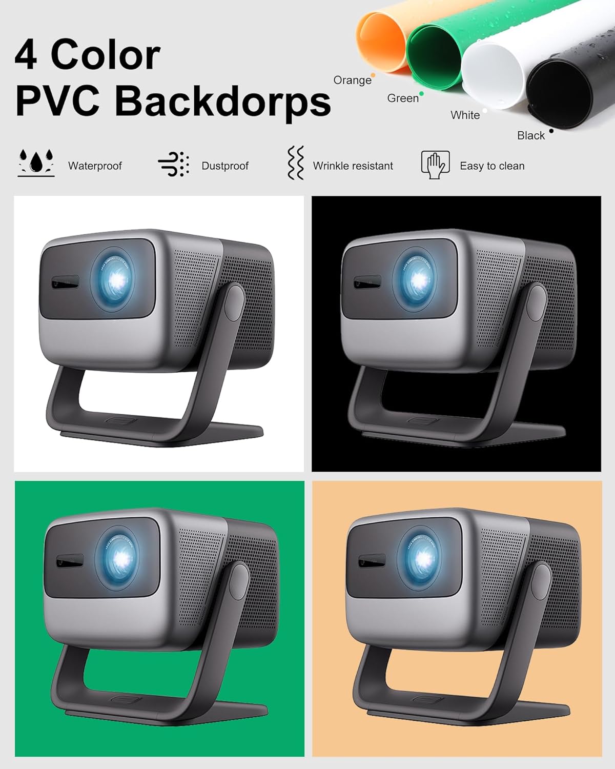 Olvídate de las arrugas en la tela. Este kit incluye 4 fondos de PVC de alta durabilidad en colores blanco, negro, naranjo y verde. Son impermeables, fáciles de limpiar y te permiten cambiar el estilo de tus fotos en segundos.