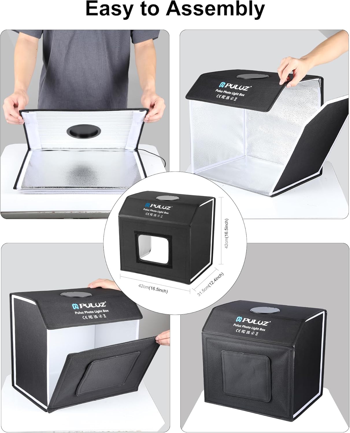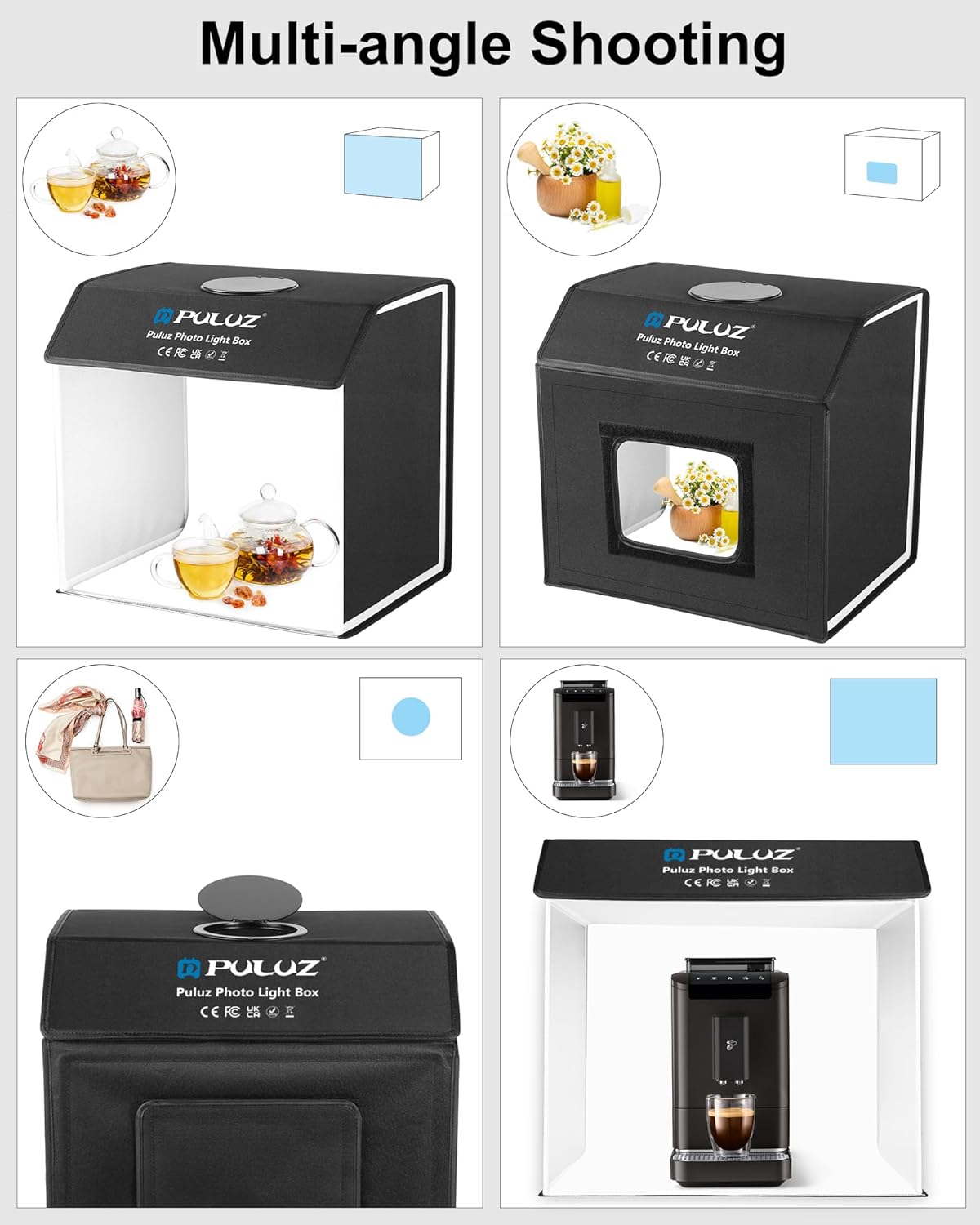 Incluye un paño difusor de luz que suaviza la iluminación LED, eliminando las sombras duras y los puntos de luz excesivos en objetos reflectantes. Además, su diseño permite tomar fotos desde el frente o desde arriba (cenital) gracias a sus múltiples aberturas.