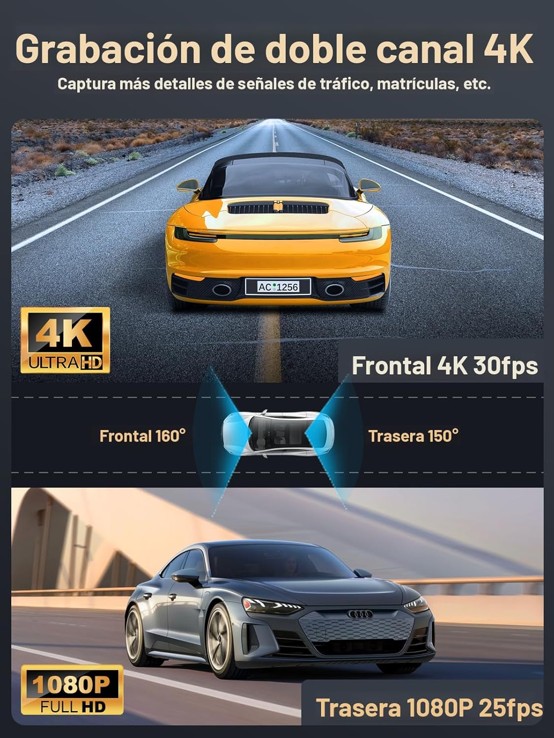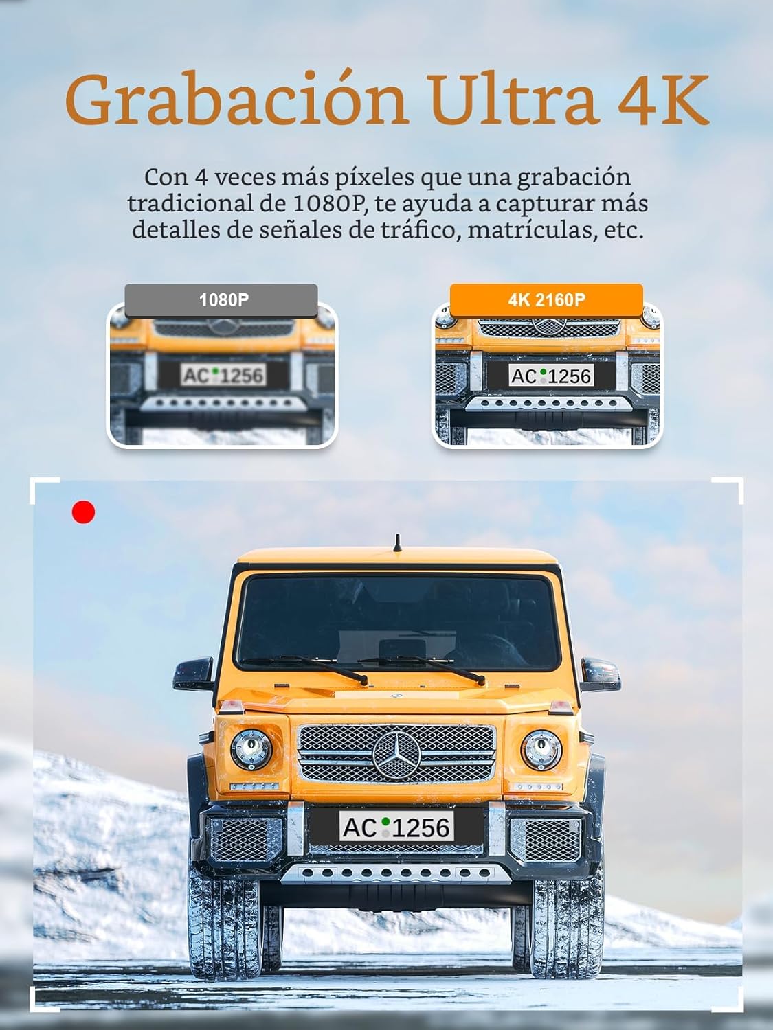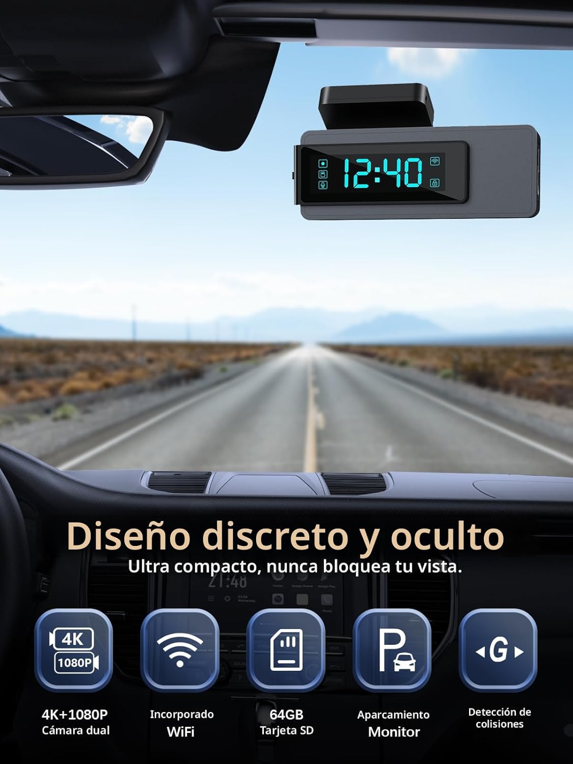 Protege tu vehiculo en todo momento con esta increible camara de auto doble Graba tus viajes con una calidad ultra HD 4K en la parte delantera y 1080P en la trasera para no perder ningun detalle de las patentes o señales de transito Incluye una tarjeta de memoria de 64GB gratis para que comiences a grabar de inmediato Su diseño compacto se oculta perfecto tras el espejo retrovisor para no tapar tu vista y gracias a su conexion WiFi puedes ver y descargar los videos directo a tu celular con su aplicacion Ademas cuenta con una excelente vision nocturna para grabar super nitido en la oscuridad y un modo de vigilancia de estacionamiento para cuidar tu auto las 24 horas del dia