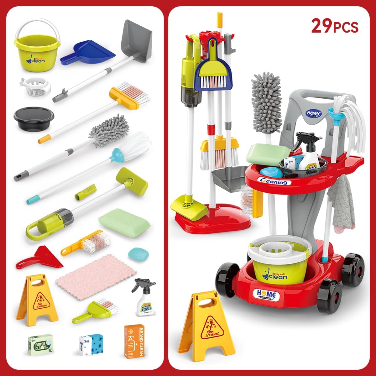 ¿Que Incluye el Set de 29 Piezas? Carrito de limpieza movil, Aspiradora electronica, Escoba, Recogedor, Mopa, Cepillo de mano, Botellas de detergente (juguete), Esponja, Cubo, Señal de “Piso Mojado” y muchos accesorios mas.