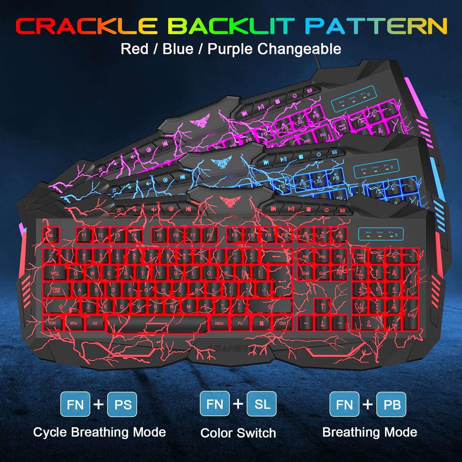 El teclado cuenta con retroiluminacion que permite alternar entre tres colores y un modo de respiracion automatica ofreciendo un efecto visual agrietado muy atractivo Dispone de ciento catorce teclas en total incluyendo diez teclas multimedia para accesos rapidos al volumen o la calculadora y diecinueve teclas sin conflicto para presionar varias opciones simultaneamente Su diseño ergonomico incorpora dos patas ajustables en la parte trasera y almohadillas de goma antideslizantes logrando una escritura sumamente comoda