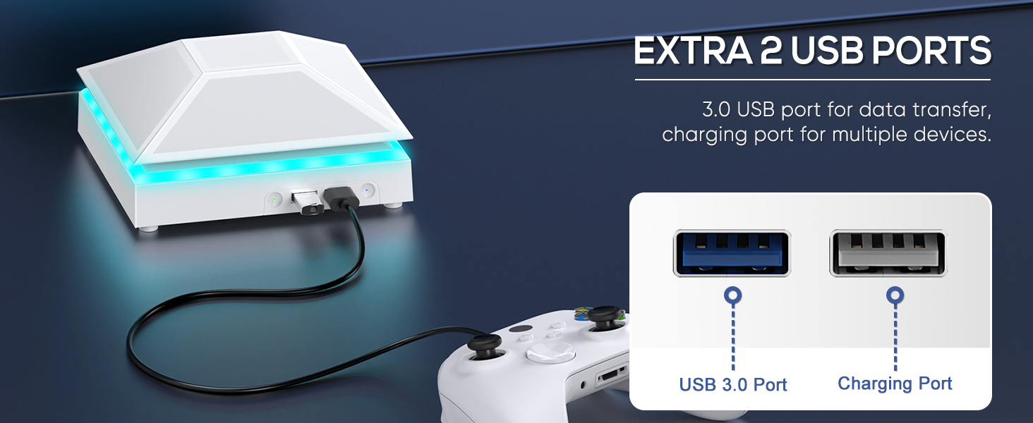 No te quedes sin conexión. El equipo trae dos puertos USB para hacerte la vida más fácil. Un puerto azul de alta velocidad para transferir datos y un puerto blanco secundario exclusivo para cargar tus controles o el celular.