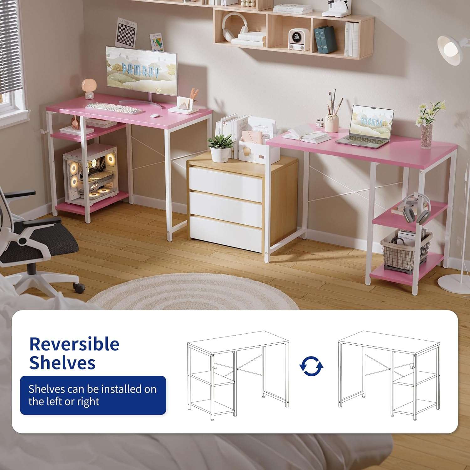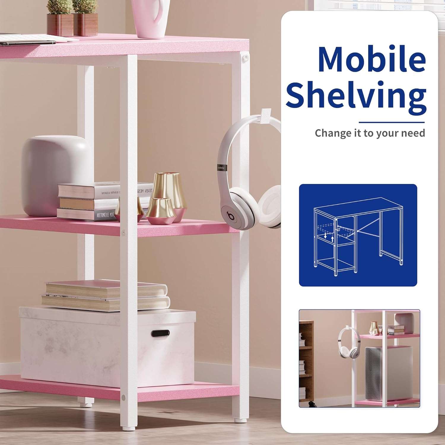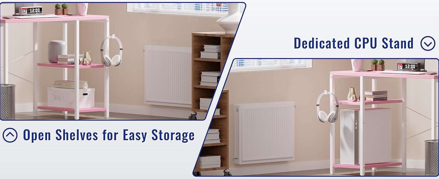 El diseño de este escritorio cuenta con dos estantes de almacenamiento ideales para organizar libros documentos o equipos de juego Estos estantes ofrecen una versatilidad excepcional ya que se pueden instalar en el lado izquierdo o en el derecho segun sus necesidades de espacio y el estante central es completamente ajustable en altura Ademas incluye un practico gancho lateral que resulta perfecto para colgar sus auriculares un bolso u otros accesorios manteniendo la superficie principal totalmente despejada y ordenada