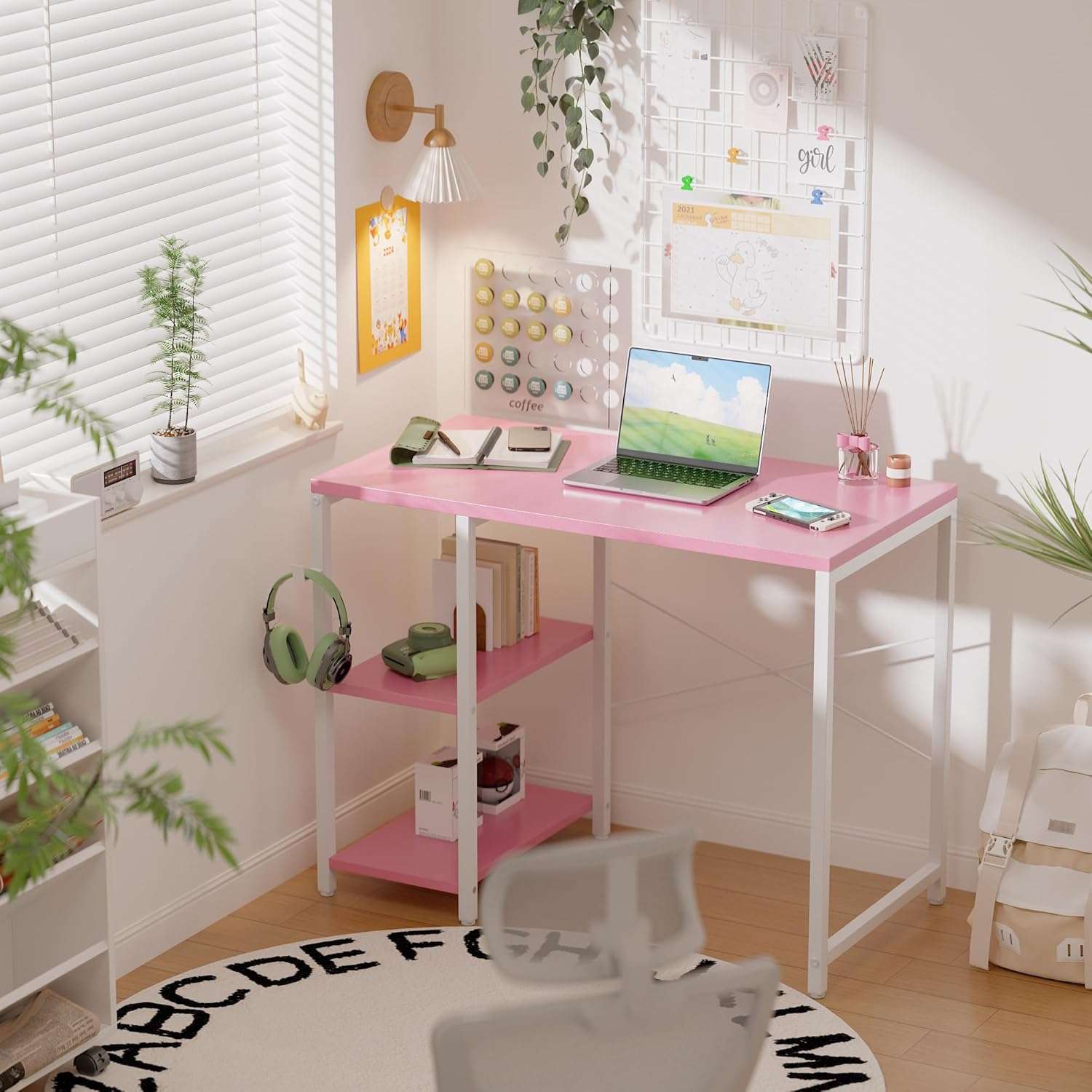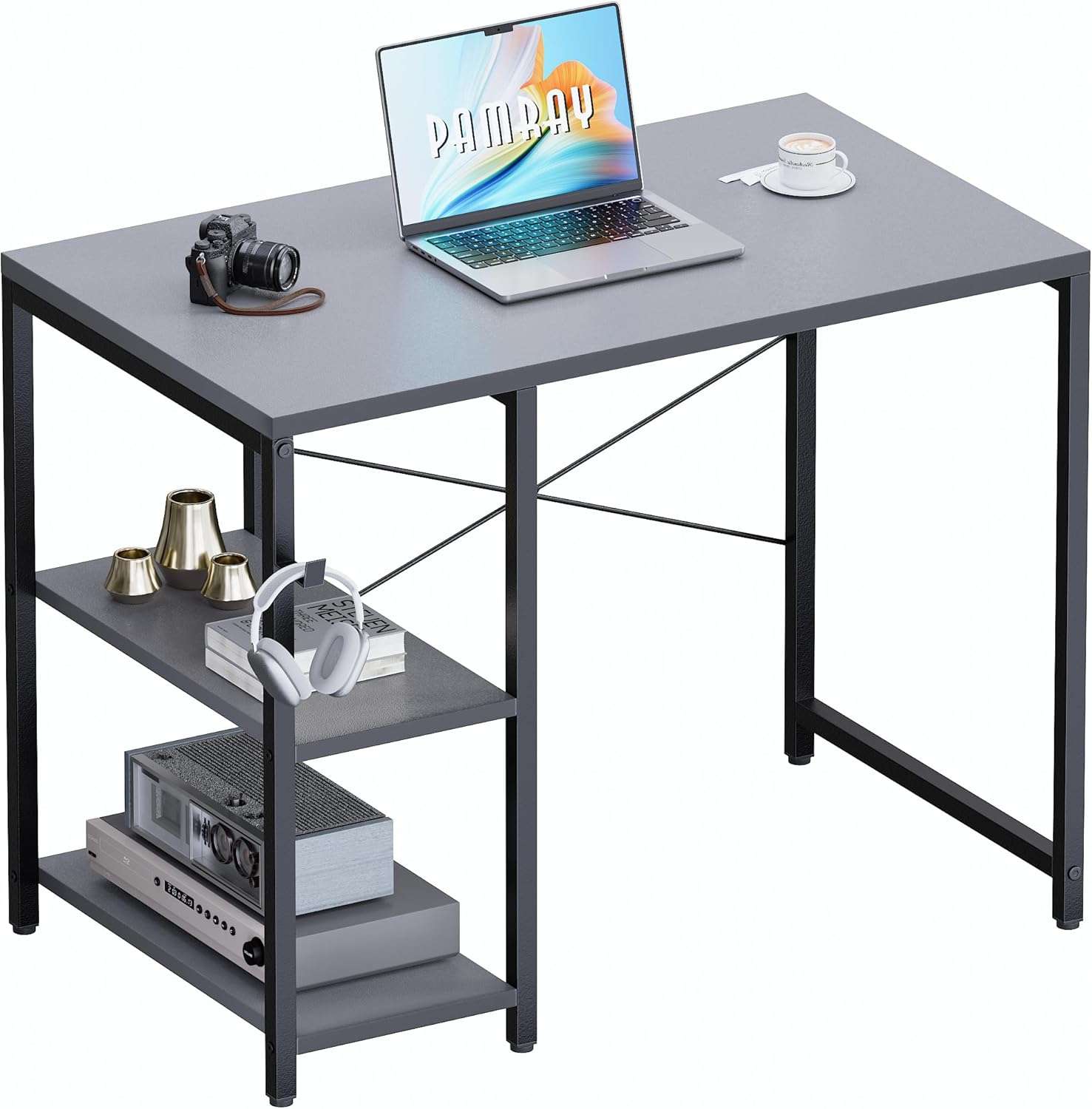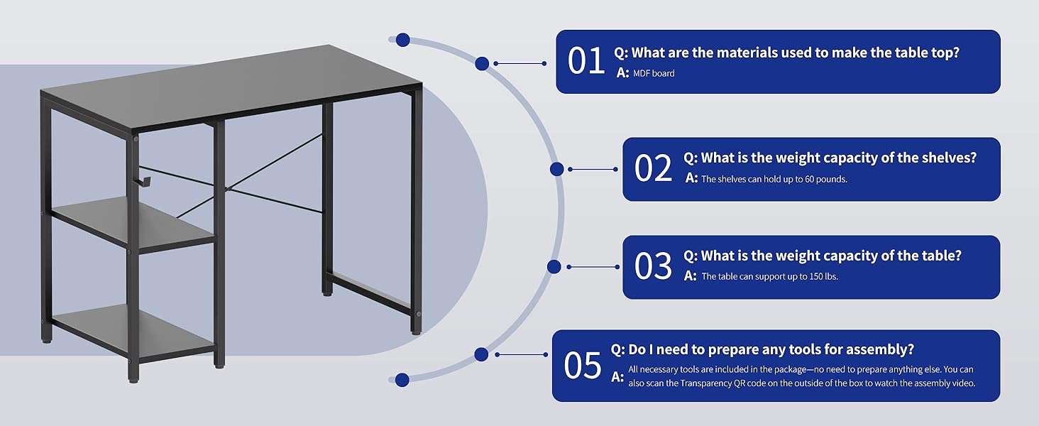 El diseño de este escritorio cuenta con dos estantes de almacenamiento ideales para organizar libros documentos o equipos de juego Estos estantes ofrecen una versatilidad excepcional ya que se pueden instalar en el lado izquierdo o en el derecho segun sus necesidades de espacio y el estante central es completamente ajustable en altura Ademas incluye un practico gancho lateral que resulta perfecto para colgar sus auriculares un bolso u otros accesorios manteniendo la superficie principal totalmente despejada y ordenada