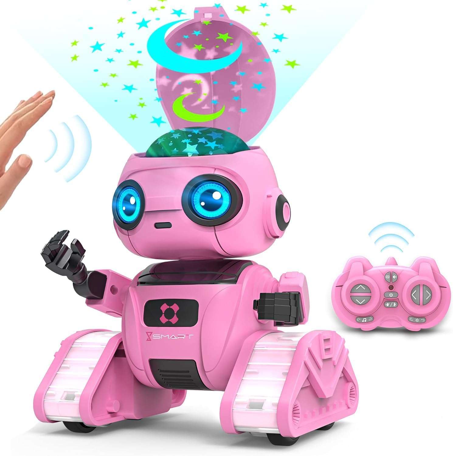 El robot destaca por sus multiples funciones de entretenimiento incluyendo grandes ojos LED que pueden cambiar de color y la capacidad de cantar una gran variedad de canciones Una caracteristica verdaderamente unica es la tapa abatible en su cabeza que activa un hermoso proyector de luz con diferentes colores Esta funcion es ideal para usar como lampara relajante por las noches sirviendo de compañero nocturno para ayudar a las mas pequeñas a conciliar el sueño tranquilamente