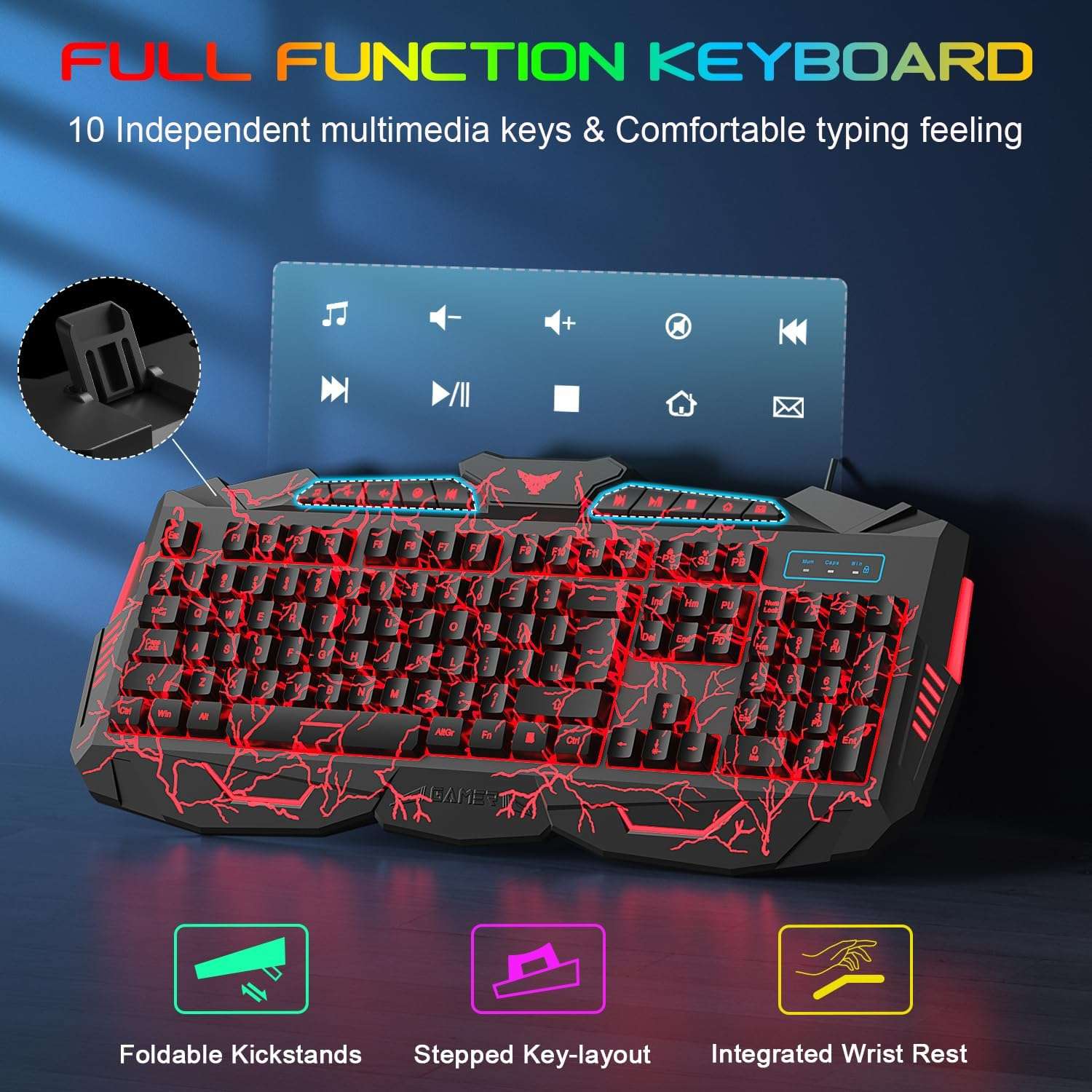 El teclado cuenta con ciento catorce teclas diseñadas especificamente para juegos y productividad con letras luminosas grabadas con laser que nunca se desvanecen Ofrece un rendimiento fluido con un diseño ergonomico e incorpora diez teclas multimedia para un acceso rapido a sus funciones favoritas Su atractivo principal es su iluminacion de tres colores con un diseño de efecto agrietado y atractivos modos de respiracion automatica