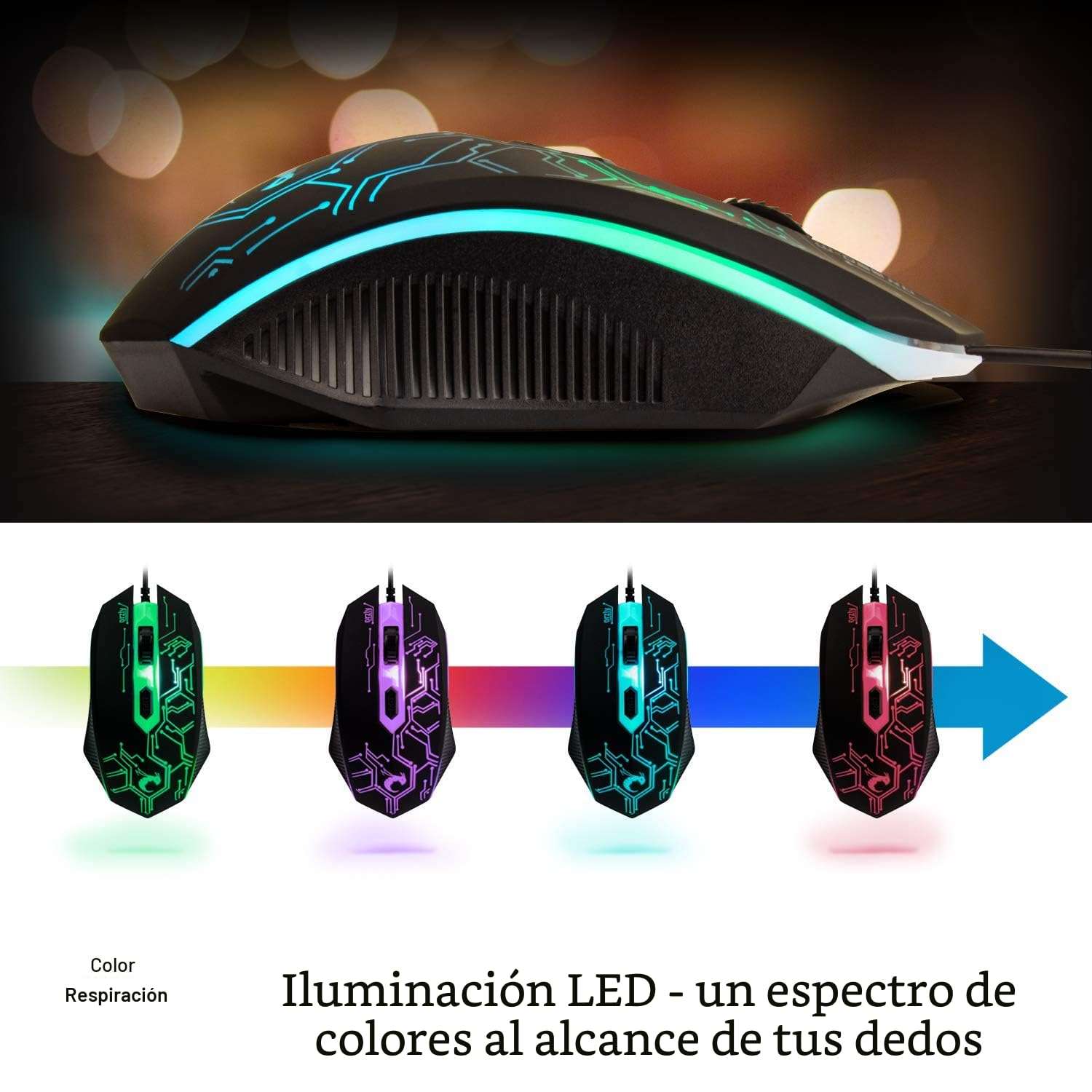 El raton es un modelo ambidiestro y muy ligero de 90 gramos perfecto tanto para jugadores zurdos como diestros Cuenta con cuatro niveles de resolucion ajustables de 1200 1600 2400 y 3200 dpi logrando cambiar la configuracion rapidamente Esta construido para resistir hasta un millon de clics y su iluminacion rgb de rotacion automatica se complementa a la perfeccion con la alfombrilla incluida que asegura movimientos suaves gracias a su base de goma antideslizante y superficie de tela de alta densidad
