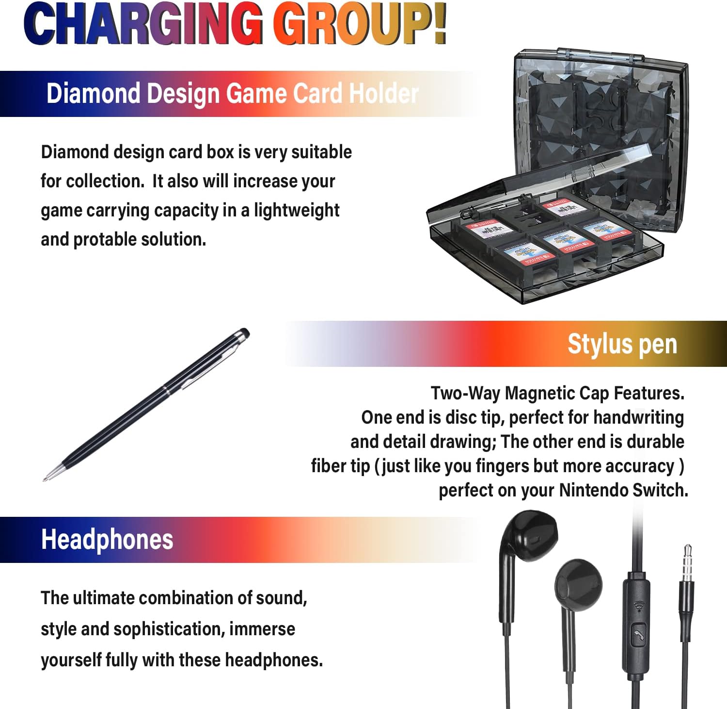Este completisimo set trae absolutamente todo lo que necesitas Incluye un bolso de transporte extra grande donde cabe hasta el cargador original y 20 juegos una carcasa protectora un soporte de mesa una lamina de vidrio templado ultra transparente y un estuche extra para guardar 8 juegos mas