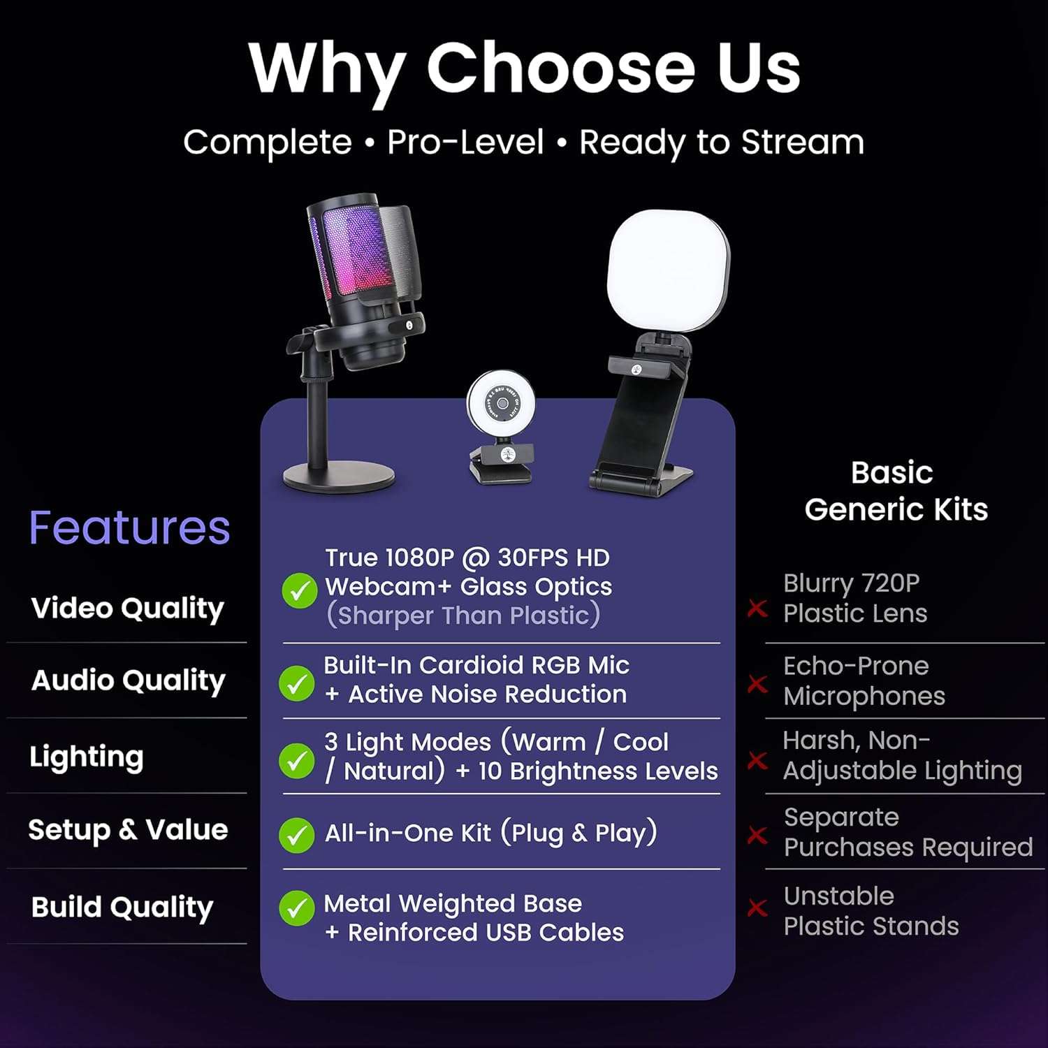 Este kit de transmision todo en uno es la opcion mas completa y buscada en Chile para jugadores y creadores de contenido que desean un equipo profesional Este paquete incluye absolutamente todo lo necesario para transmitir en vivo con alta calidad contando con una camara web de alta definicion un microfono usb y una luz led ajustable siendo ideal para plataformas de video streaming podcasting o trabajo remoto