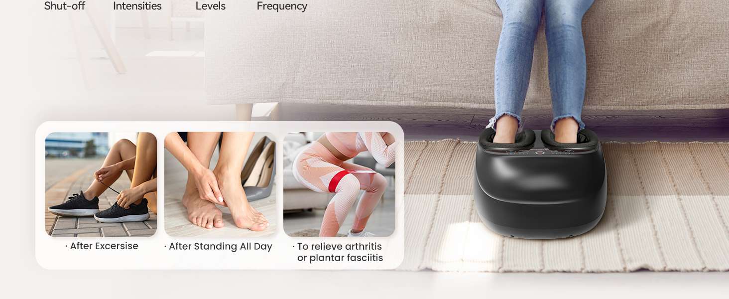 El equipo le permite adaptar totalmente su masaje eligiendo entre tres niveles de intensidad bajo medio y alto Cuenta con un temporizador inteligente que apaga la maquina automaticamente despues de quince minutos de uso para garantizar su total seguridad y prevenir el sobrecalentamiento Ademas incluye una practica funcion de pausa que mantiene el tiempo restante si necesita detenerse por un momento Sus fundas interiores son completamente extraibles y lavables asegurando una higiene perfecta para toda la familia