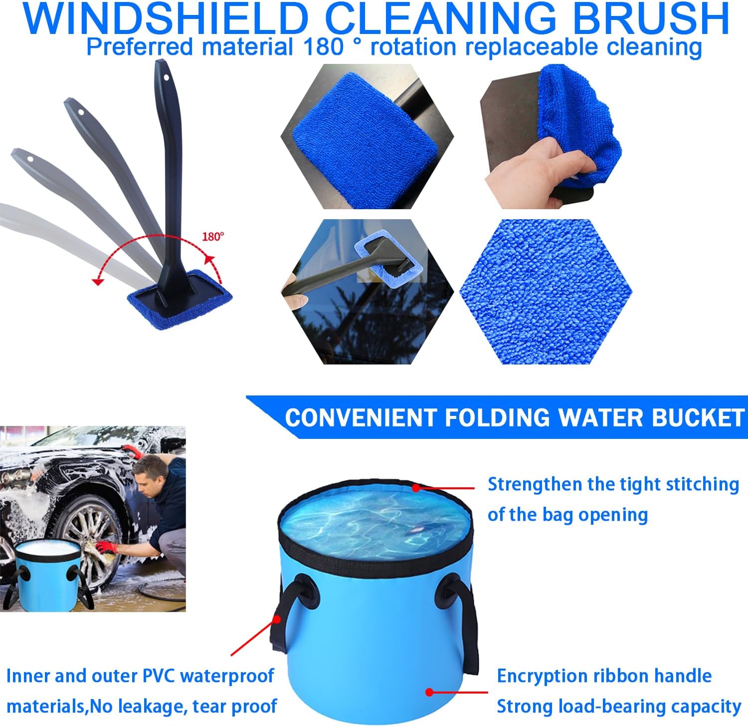 Para lavar por fuera trae un tremendo trapeador extensible que llega hasta los 64 centimetros con un cabezal que gira para limpiar el techo sin rayar Ademas incluye un balde plegable ideal para ahorrar espacio un guante de lavado gigante toallas absorbentes almohadillas para encerar y una botella spray para tus liquimos favoritos