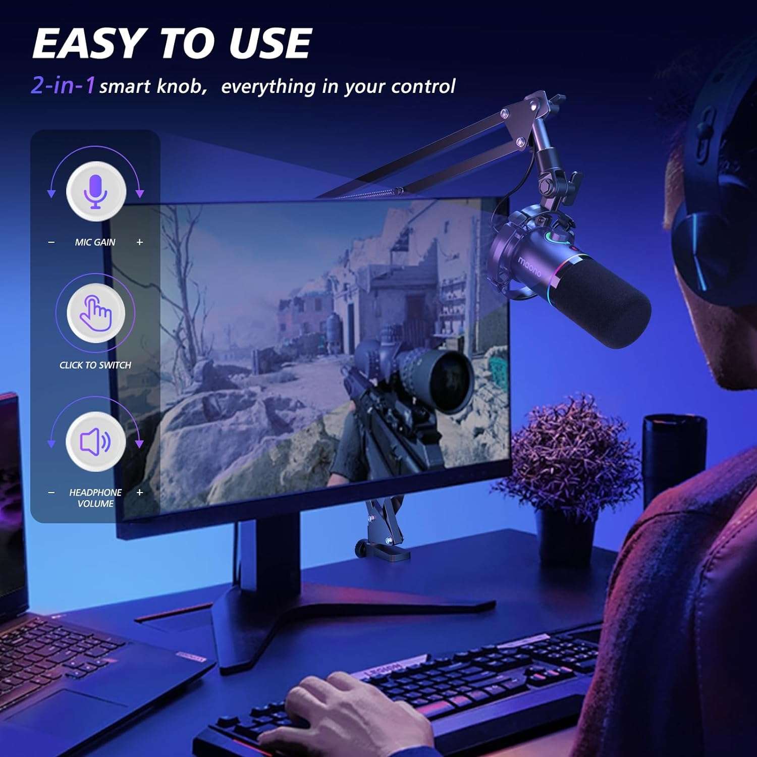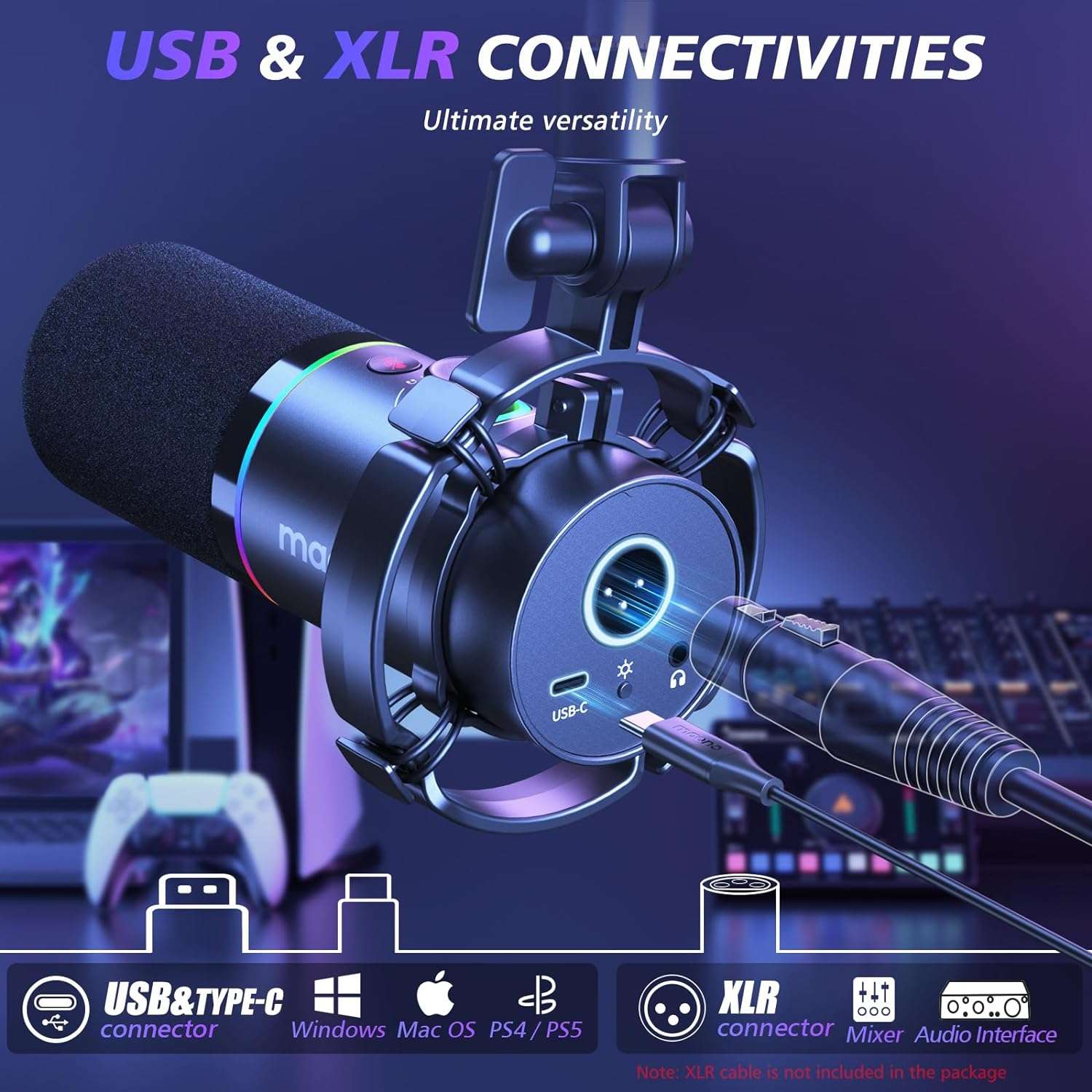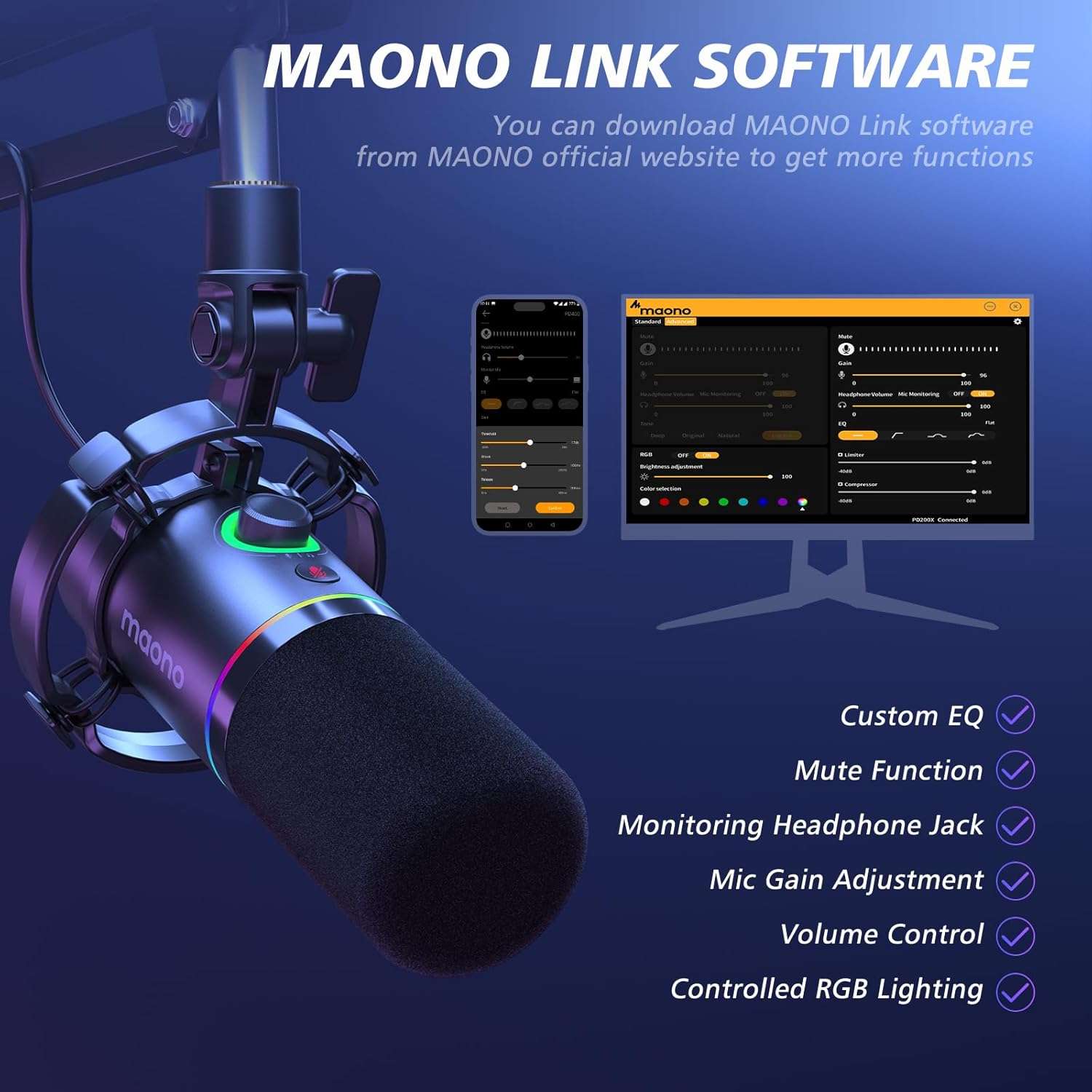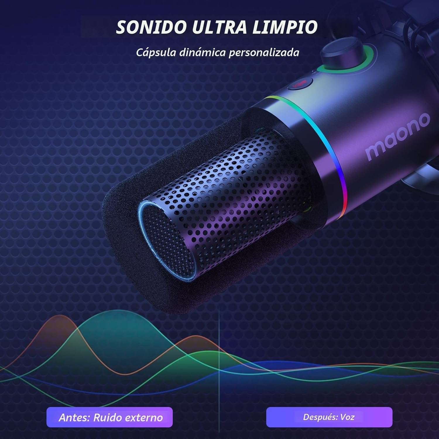 Su salida de modo dual ofrece una conexion USB directa mediante un cable de 250 centimetros ideal para computadores portatiles o de escritorio La salida analogica XLR permite conectarlo a interfaces profesionales o mezcladoras Al usarlo en modo USB podra explorar configuraciones avanzadas mediante el software Maono Link donde puede encender o apagar la luz RGB cambiar entre 9 colores diferentes y ajustar el ecualizador y el compresor