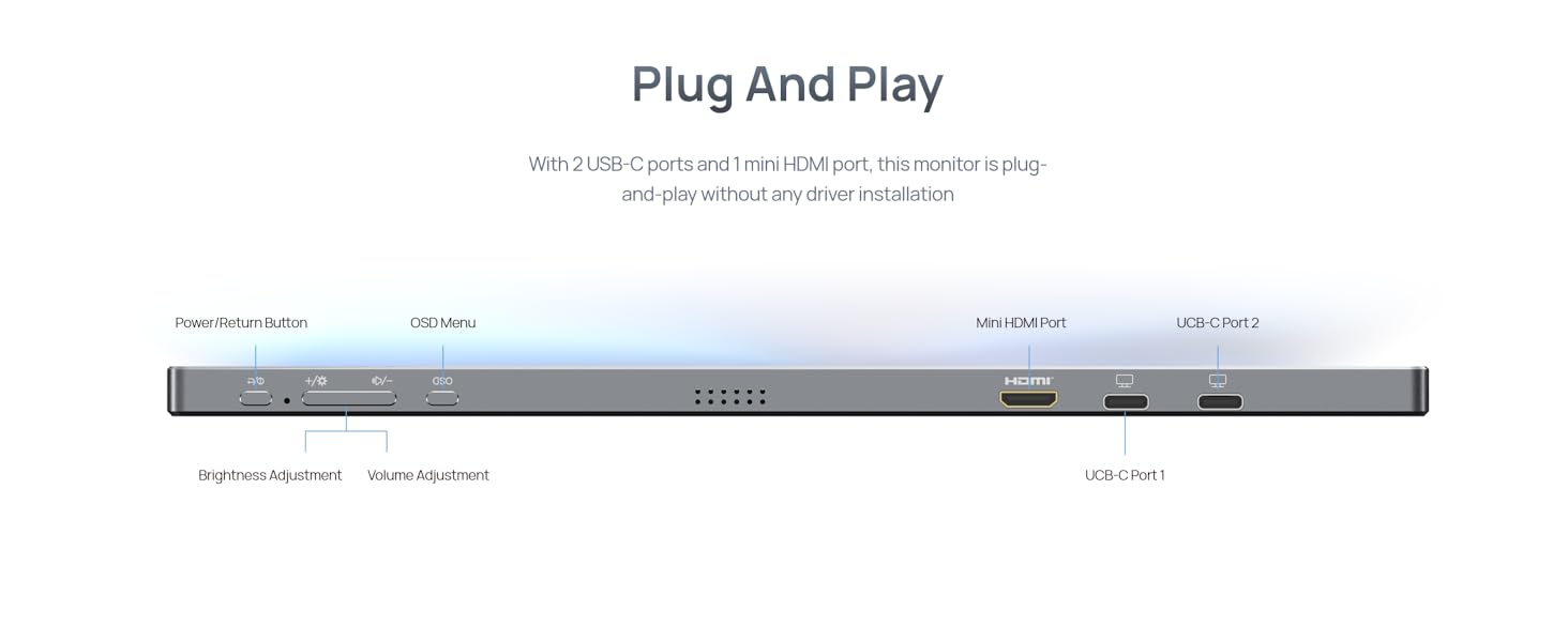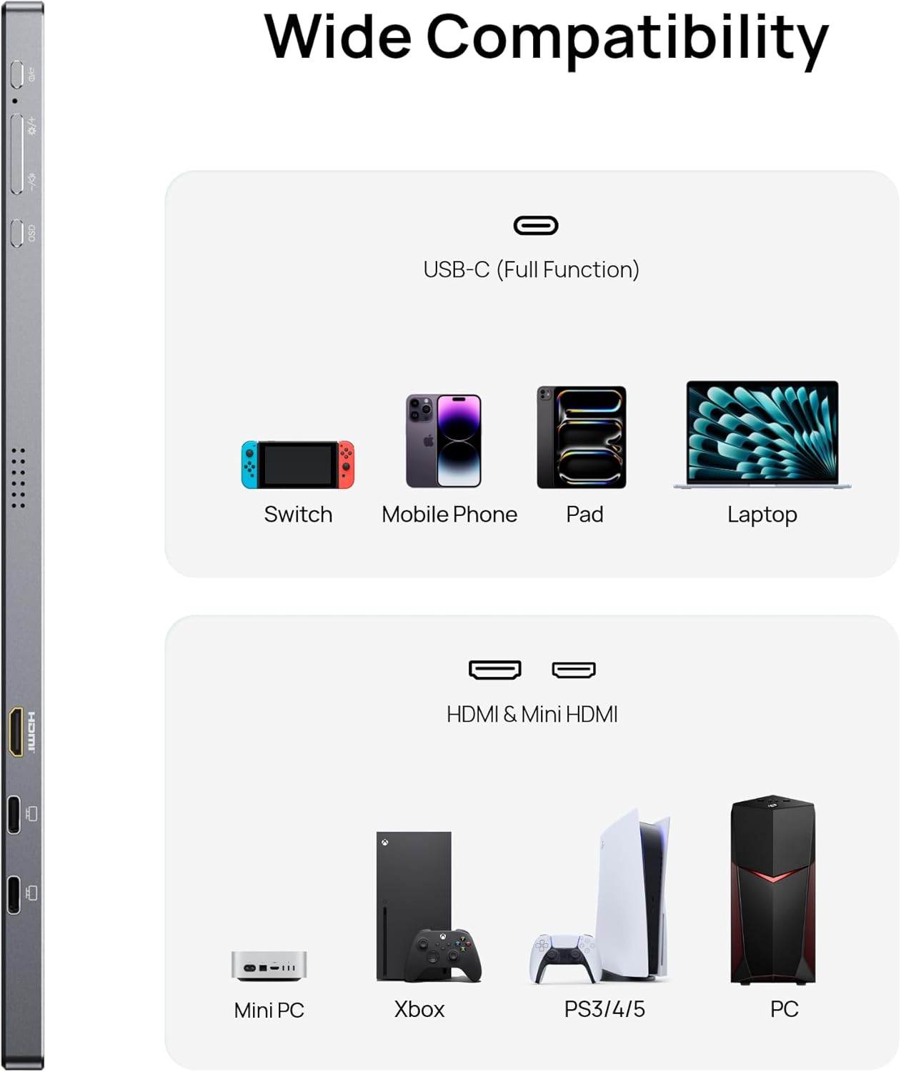 Compatibilidad Total Conecta y Usa de Inmediato Viene equipado con puertos USB tipo C y mini HDMI para conectarse perfectamente a cualquier dispositivo Usalo como pantalla extendida o duplicada con tu computador portatil PC Mac telefonos inteligentes consolas PlayStation o Xbox Su conexion es directa sin necesidad de instalar programas entregando una transmision de datos totalmente estable.
