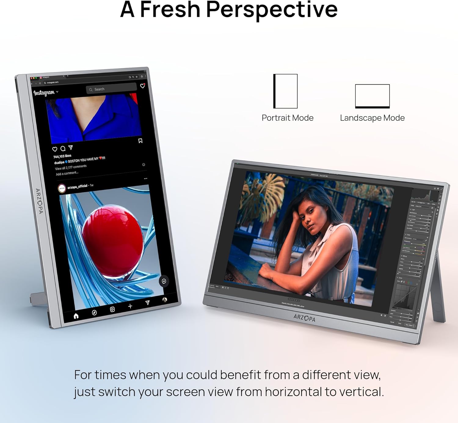 Soporte Metalico Integrado Horizontal y Vertical Olvidate de llevar fundas incomodas o pesadas Cuenta con un soporte de metal super resistente integrado en la parte trasera que mantiene el monitor totalmente firme Te permite cambiar sin esfuerzo entre modo horizontal para jugar o ver peliculas y modo vertical que es ideal para leer documentos largos o programar