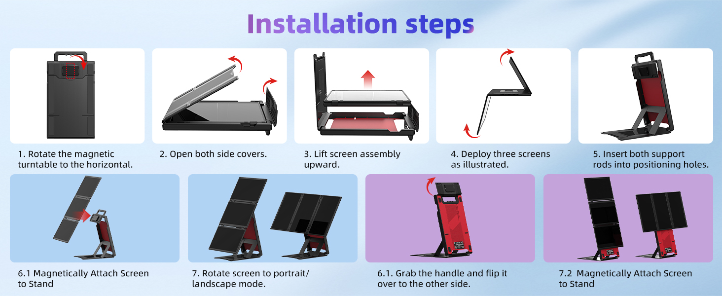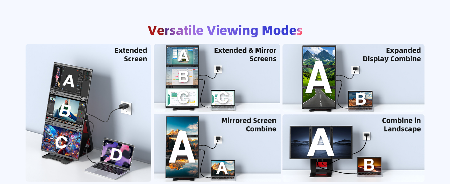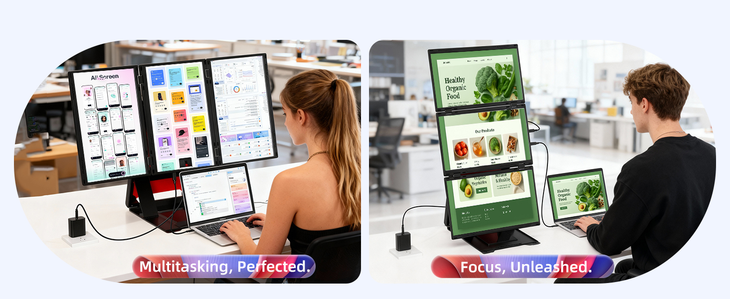 Maxima Flexibilidad y Rotacion Trabaja exactamente como tu prefieras. Puedes elegir entre el modo extendido, espejo o el lienzo combinado, con la libertad de apagar la tercera pantalla de forma independiente si no la necesitas. Ademas, su sistema permite una rotacion de 360 grados, ideal para colocar las pantallas en formato vertical para programar y leer, o en formato horizontal para una experiencia inmersiva.