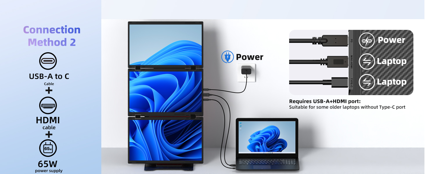 Energia Estable y Conexion Rapida Configura tu estacion en un par de minutos. Al alimentar tres pantallas simultaneamente, este modelo incluye su propio adaptador de corriente de 65 Watts para garantizar un funcionamiento estable y sin parpadeos. Si tu notebook es moderno, puedes conectarlo con un solo cable Tipo C, y si es un modelo anterior, cuentas con opciones flexibles de conexion mediante USB y HDMI.