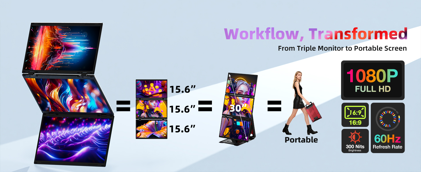 Lienzo Gigante Combinado de 30 Pulgadas Experimenta una visualizacion sin limites. Con un solo toque, puedes fusionar los tres monitores de 15.6 pulgadas en un espectacular lienzo continuo de 30 pulgadas. Esta funcion premium es la solucion perfecta para revisar archivos de codigo muy anchos, leer graficos financieros complejos o manejar lineas de tiempo en edicion de video sin los cortes de los bordes.