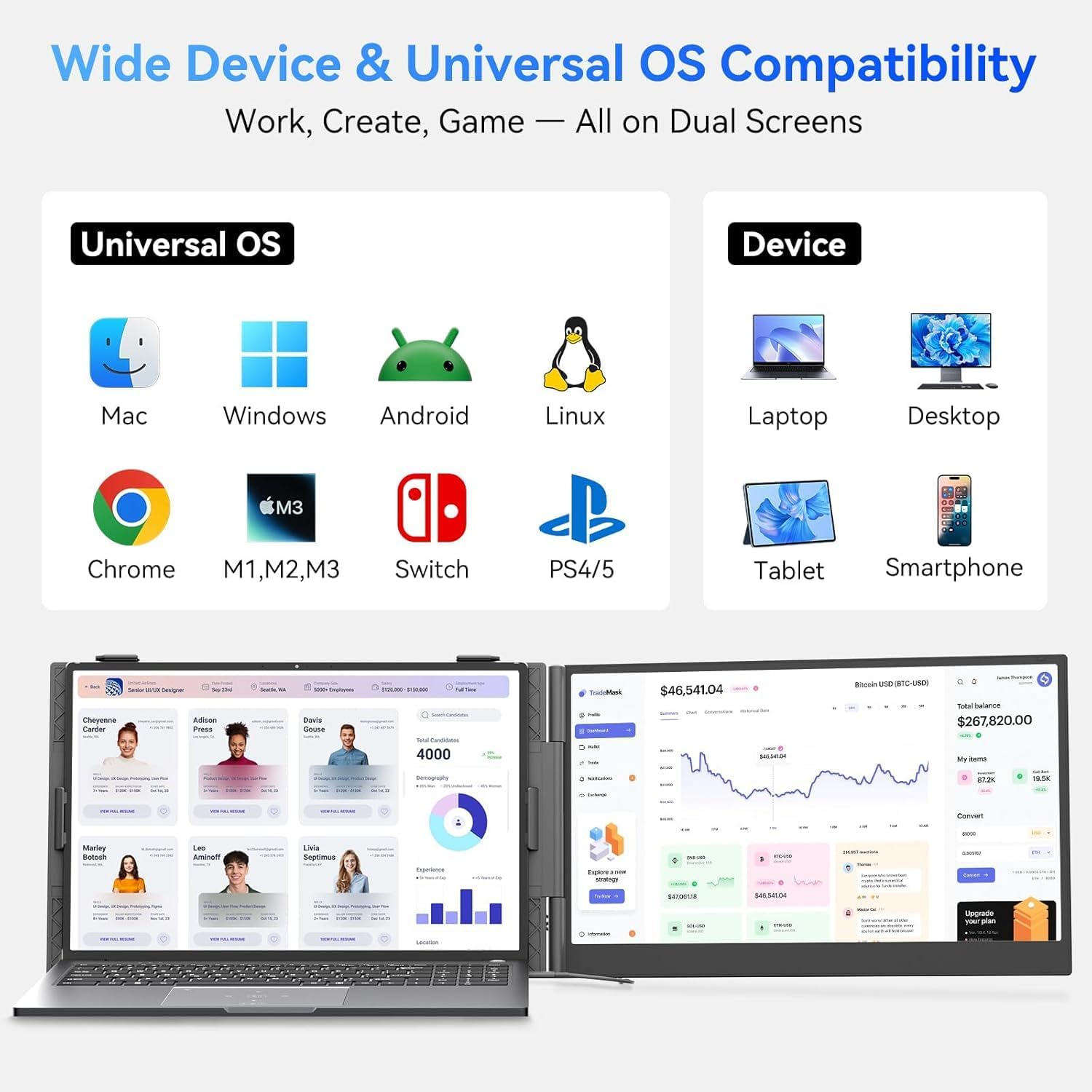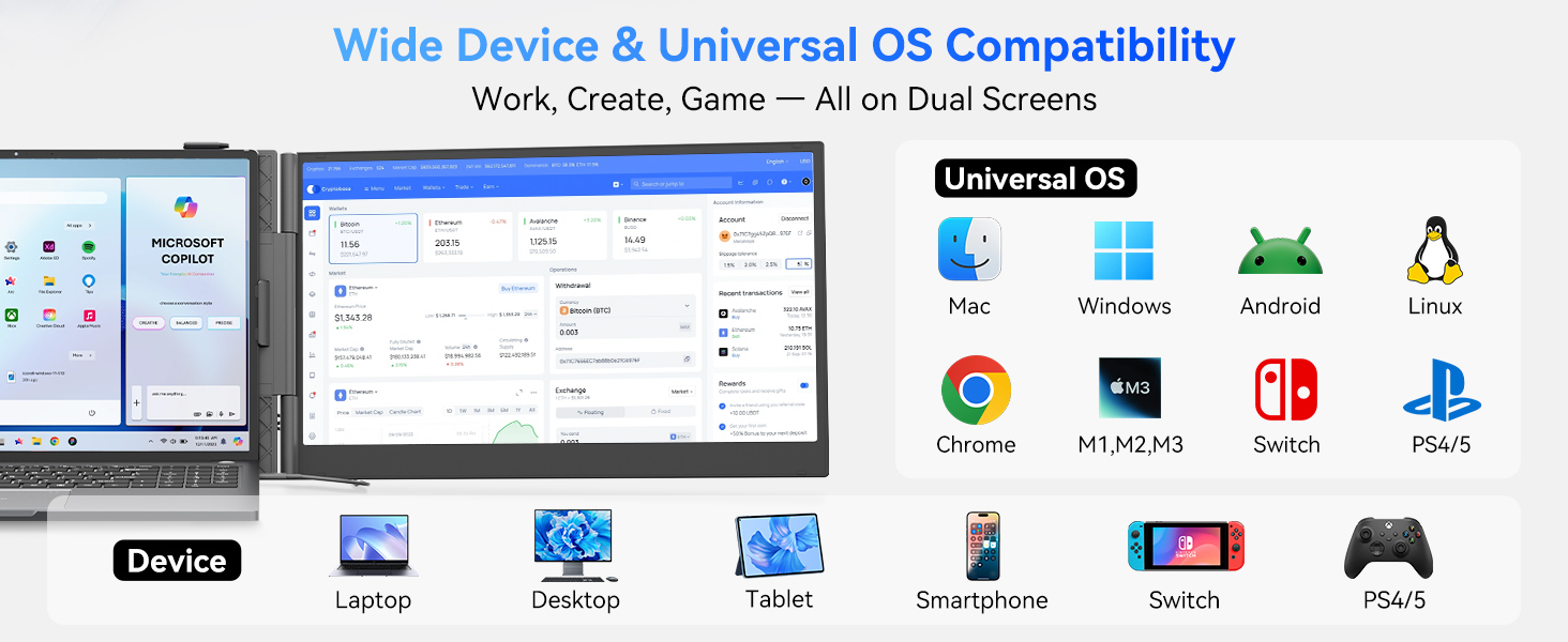 Compatibilidad Universal Este monitor extendido es la herramienta ideal para cualquier entorno tecnológico. Funciona a la perfección con sistemas Windows, Mac, ChromeOS, Android y Linux. Es compatible con notebooks, smartphones, consolas Switch y equipos con chip M1, M2 y M3 que cuenten con un puerto USB-C de función completa.