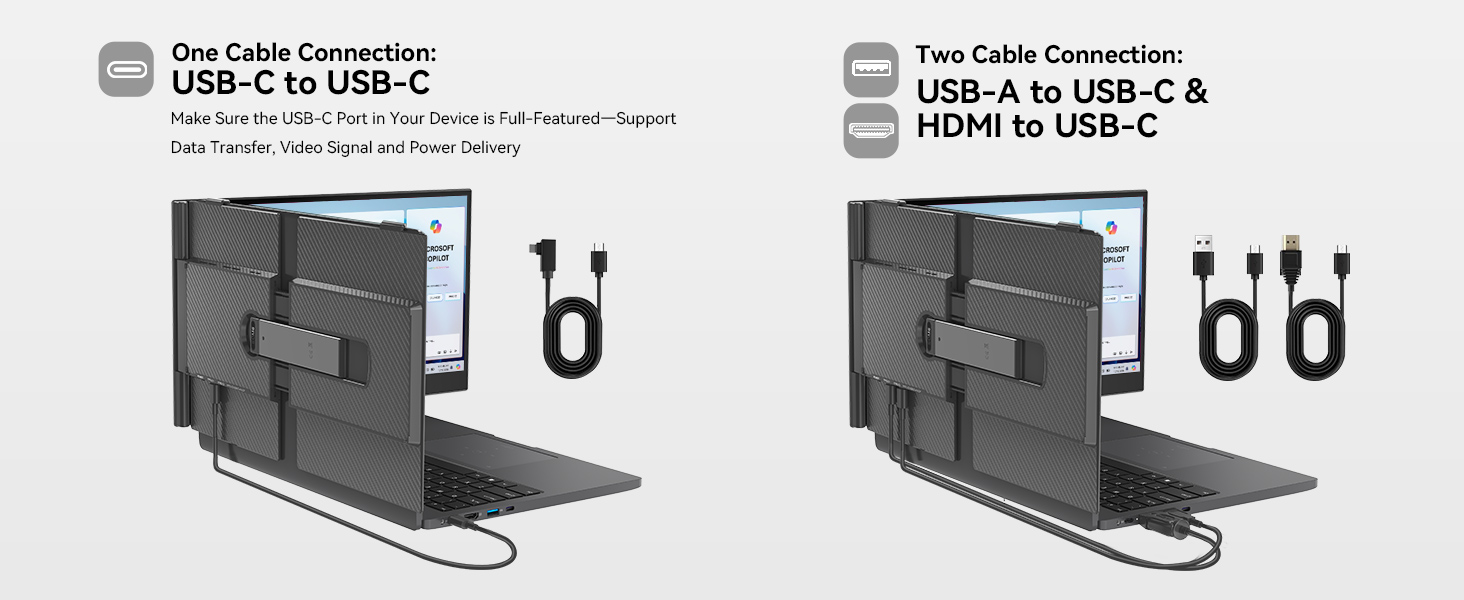 Conexión Plug and Play Sistema fácil de usar que no requiere descargas de controladores adicionales. Incluye todos los cables que necesitas para empezar: un cable Tipo C, un cable USB-C a USB-A y un cable HDMI. Puedes conectarlo directamente con un solo cable Tipo C, o usar la combinación de HDMI para la pantalla y USB para la energía. Además, incluye una funda protectora para facilitar su transporte.
