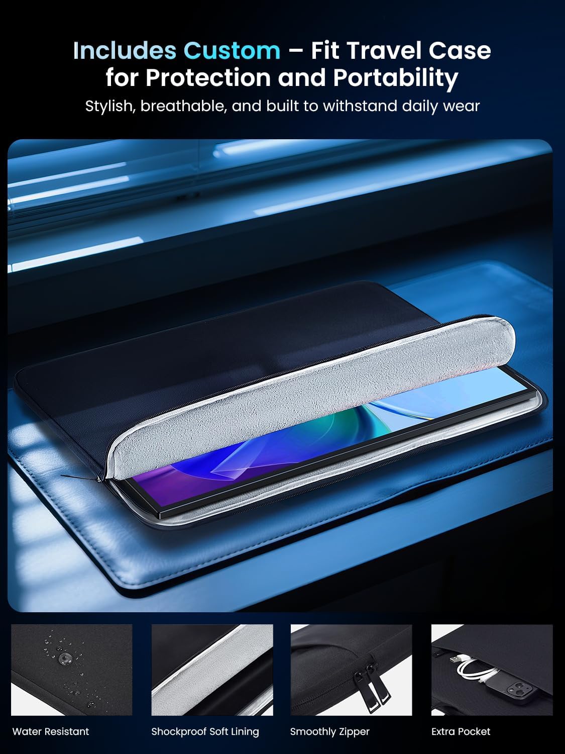 Cuerpo de Aluminio Premium y Ultradelgado Un verdadero reemplazo de escritorio que puedes llevar donde quieras. A pesar de su enorme tamano de 18.5 pulgadas, este monitor esta fabricado con una resistente aleacion de aluminio que le otorga un grosor de apenas 5 milimetros. Es un equipo sumamente duradero, disenado para resistir el uso diario de los profesionales que trabajan de forma remota.