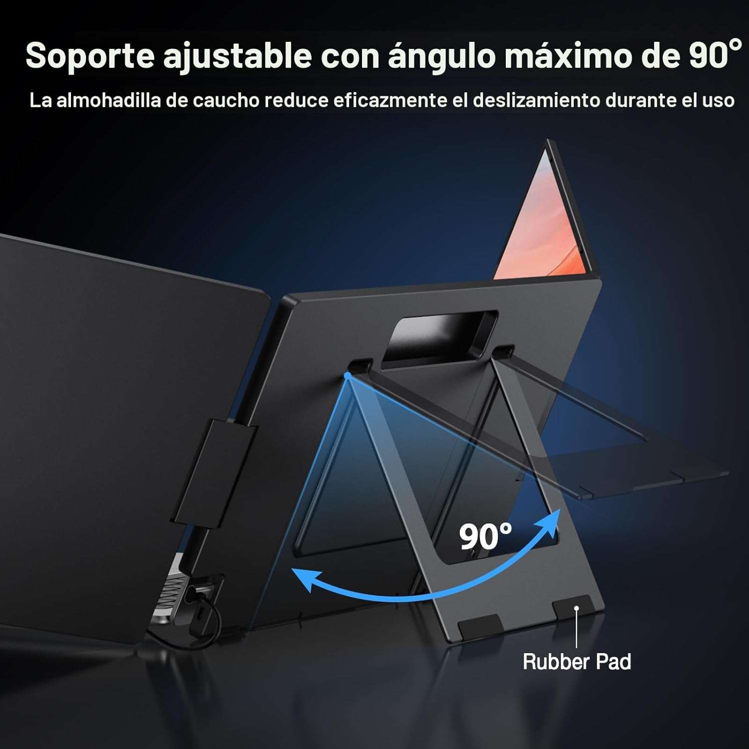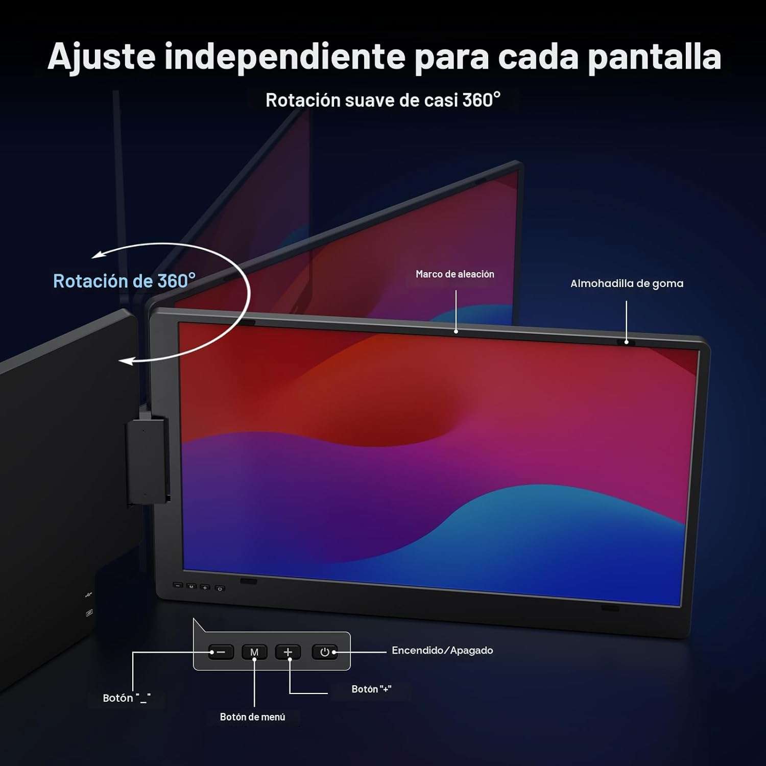 Pensando en la comodidad y el trabajo en equipo este monitor de viaje esta equipado con un soporte integrado de aleacion de aluminio ultrafino que se ajusta hasta 90 grados proporcionando gran estabilidad a su computadora Ademas cada pantalla cuenta con un asombroso sistema de rotacion de hasta 360 grados permitiendole compartir su contenido con colegas en multiples direcciones y ofreciendo un angulo de vision perfecto de 178 grados