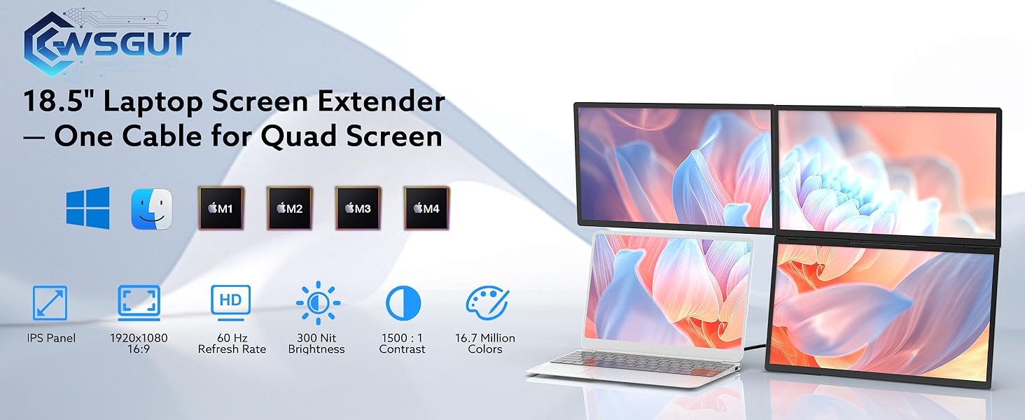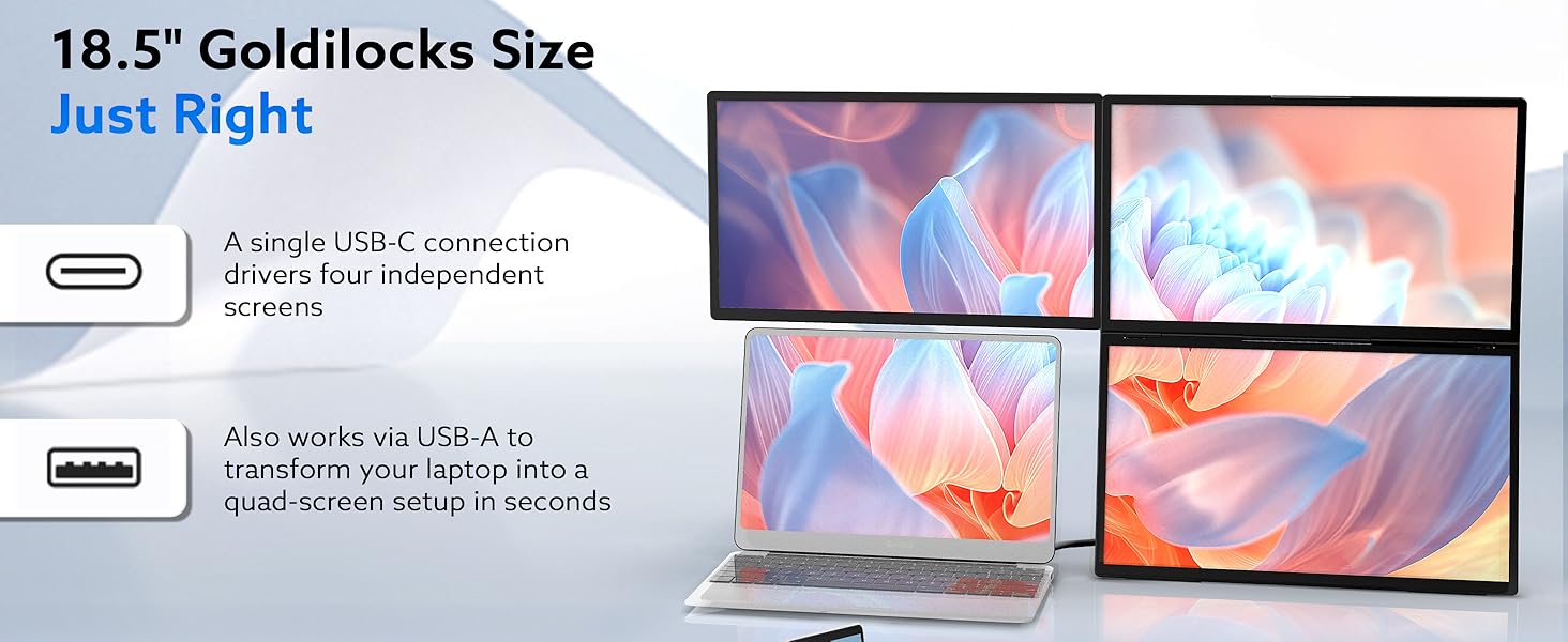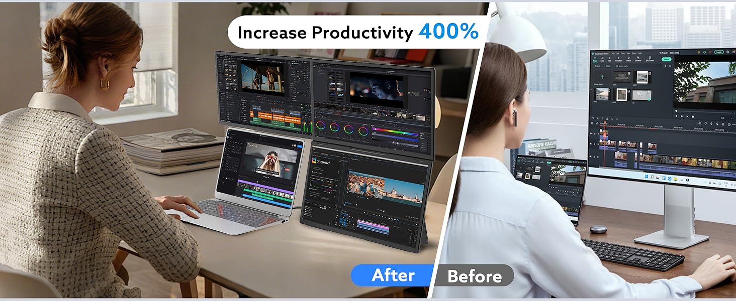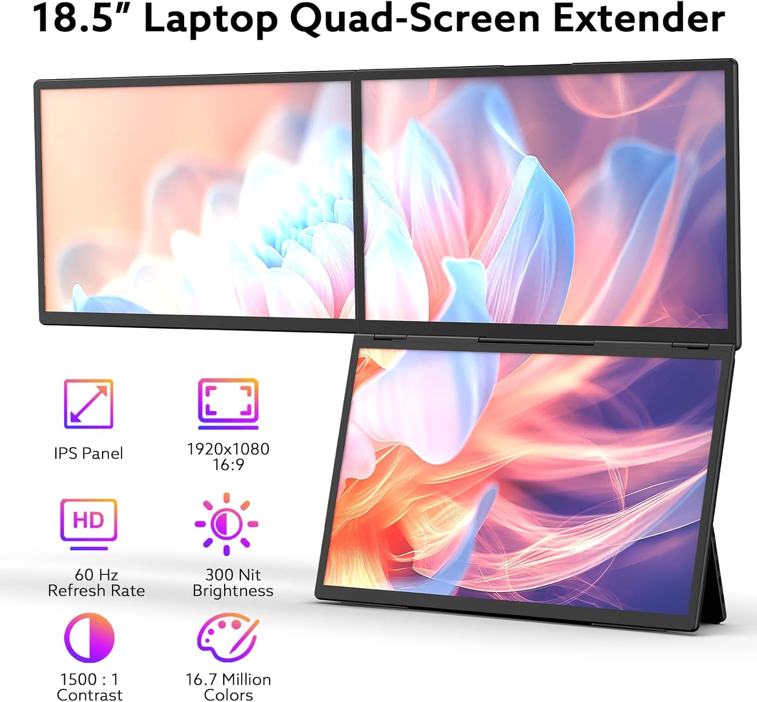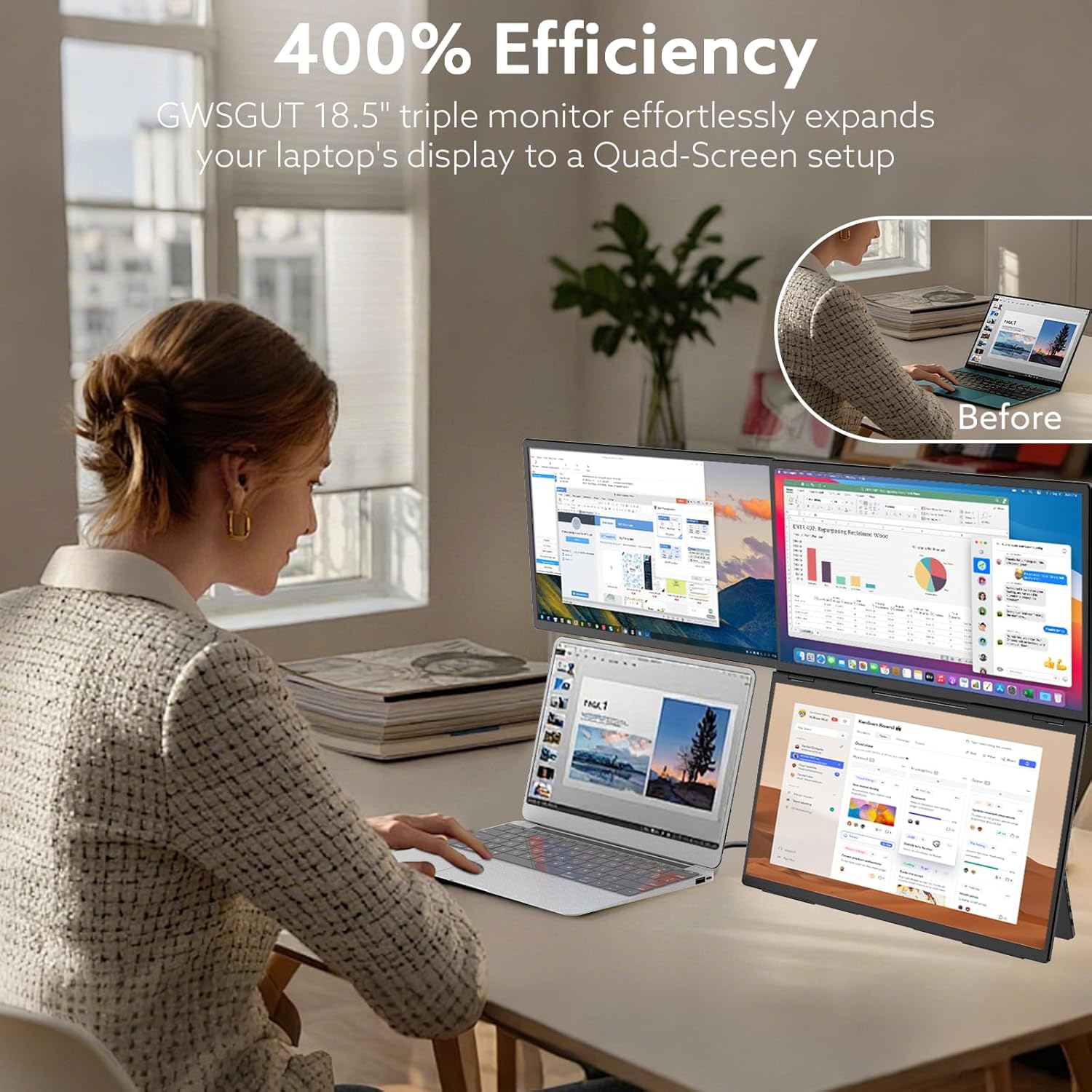 Lleva tu productividad al máximo nivel con este extensor de pantalla triple de 18.5 pulgadas. Este monitor portátil expande la pantalla de tu notebook para crear una estación de trabajo de cuatro pantallas al instante. A diferencia de otras opciones, te permite usar las pantallas de forma sincronizada o completamente independiente, multiplicando tu eficiencia en el teletrabajo o la oficina.