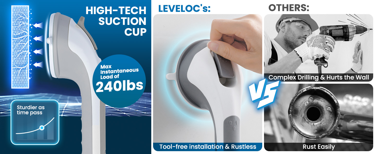 Instalacion Express: Limpia la superficie, presiona la barra contra la pared por 5 segundos y baja los pestillos de seguridad. ¡Listo! Asi de facil se bloquea y queda firme.