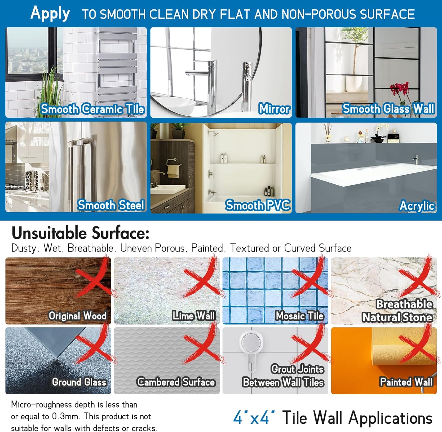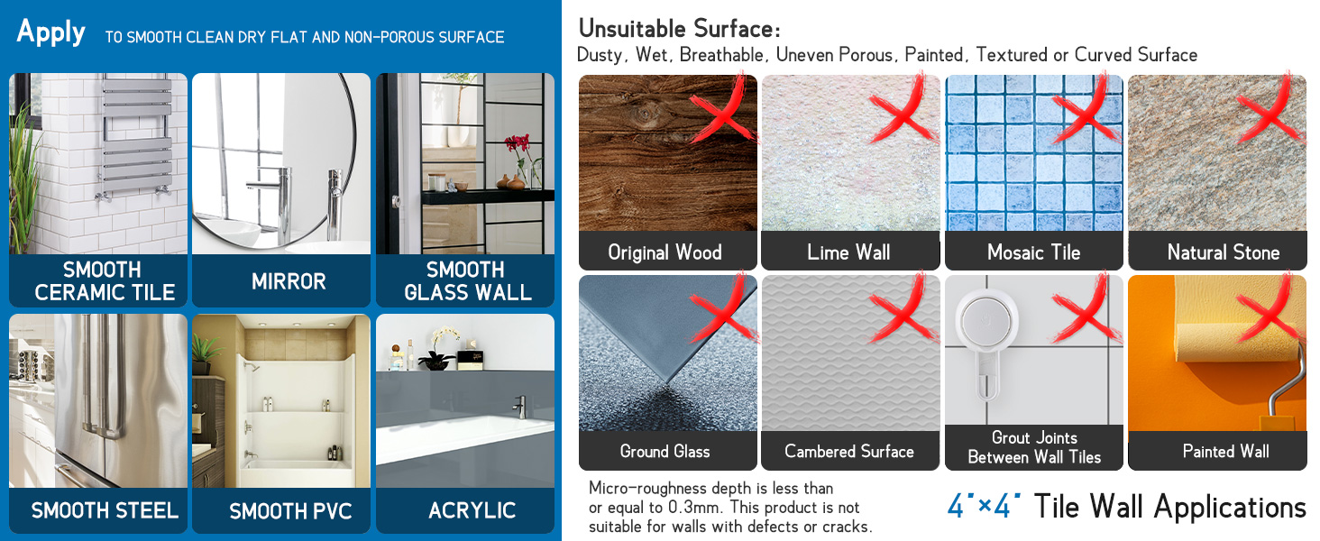 Superficies Aptas: Solo funcionan en superficies lisas y planas (vidrio, azulejos brillantes). No funcionan en paredes pintadas, madera, papel mural o azulejos porosos y pequeños (menos de 10×10 cm).