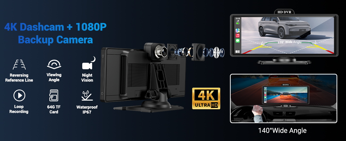 Incluye un sistema de doble camara de seguridad Una camara frontal que graba en increible resolucion 4K y una camara de retroceso 1080P a prueba de agua con vision nocturna para que estaciones con total seguridad Ademas trae de regalo una tarjeta de memoria de 64GB para que comiences a grabar tus rutas de inmediato