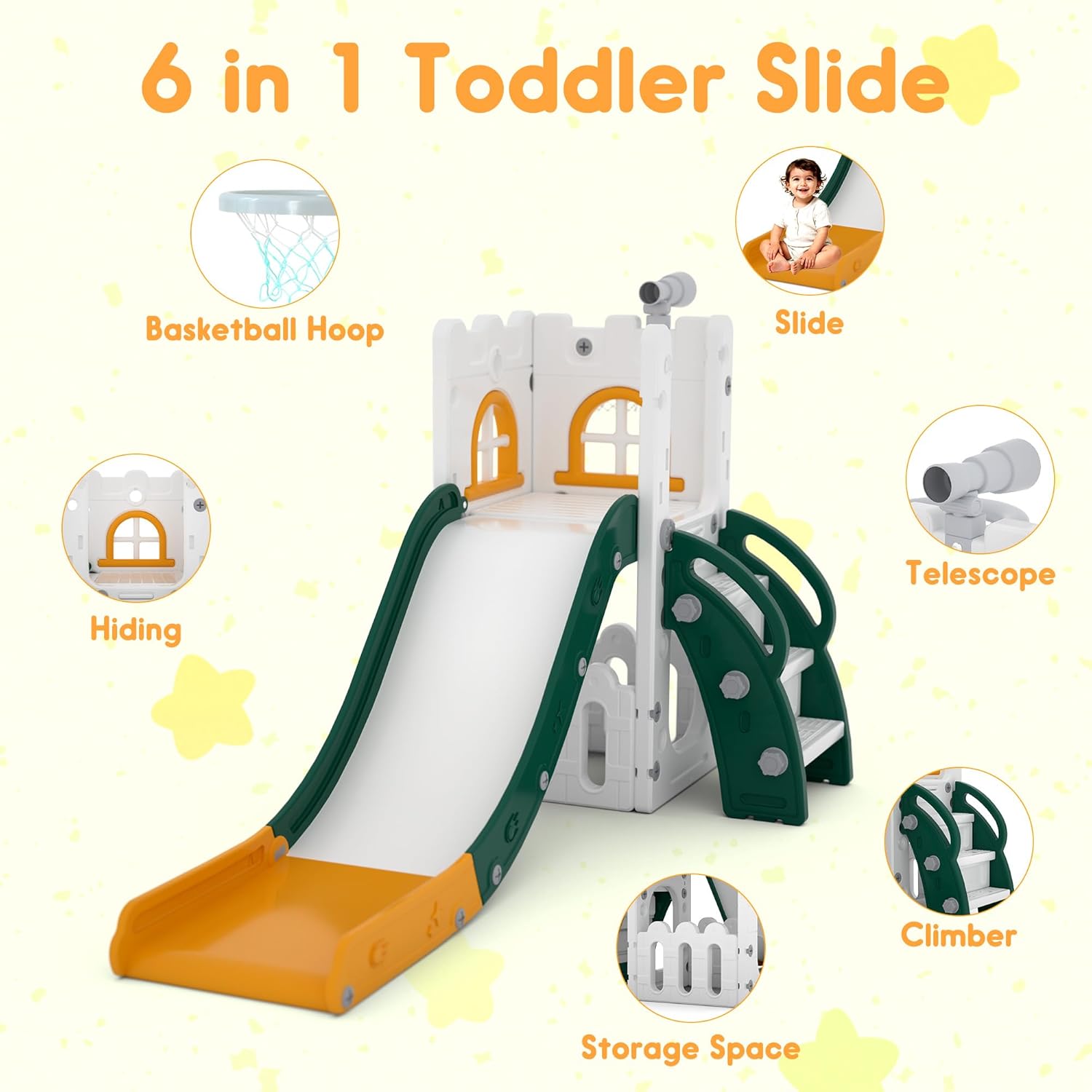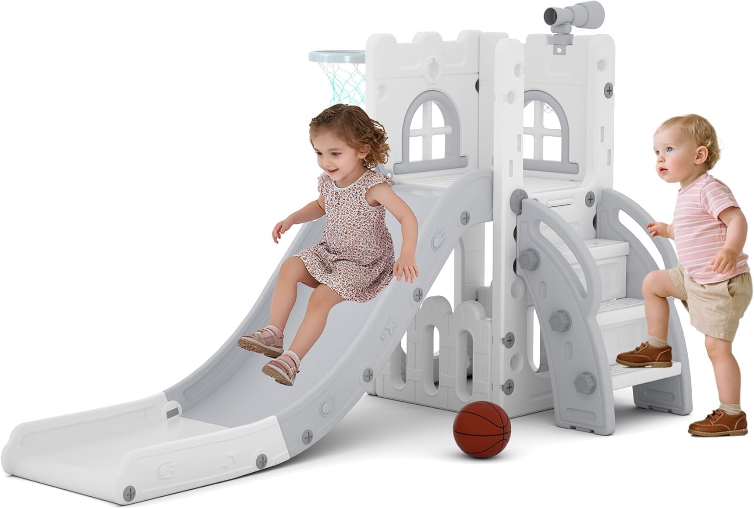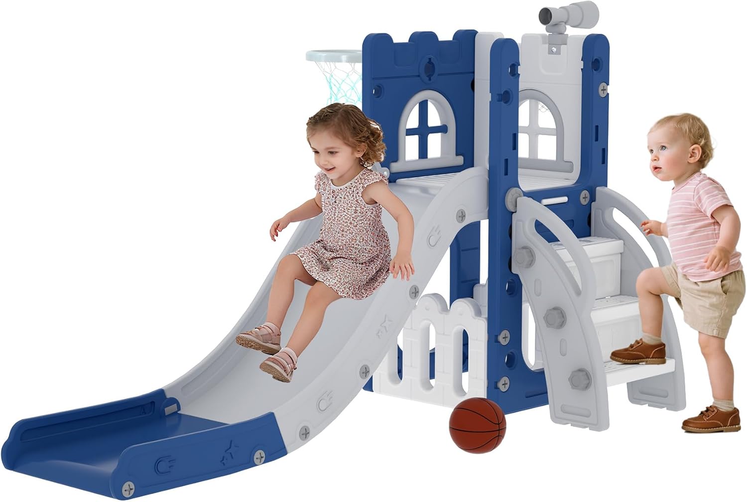Incluye: Estructura de tobogan, aro, telescopio y compartimiento de almacenaje.