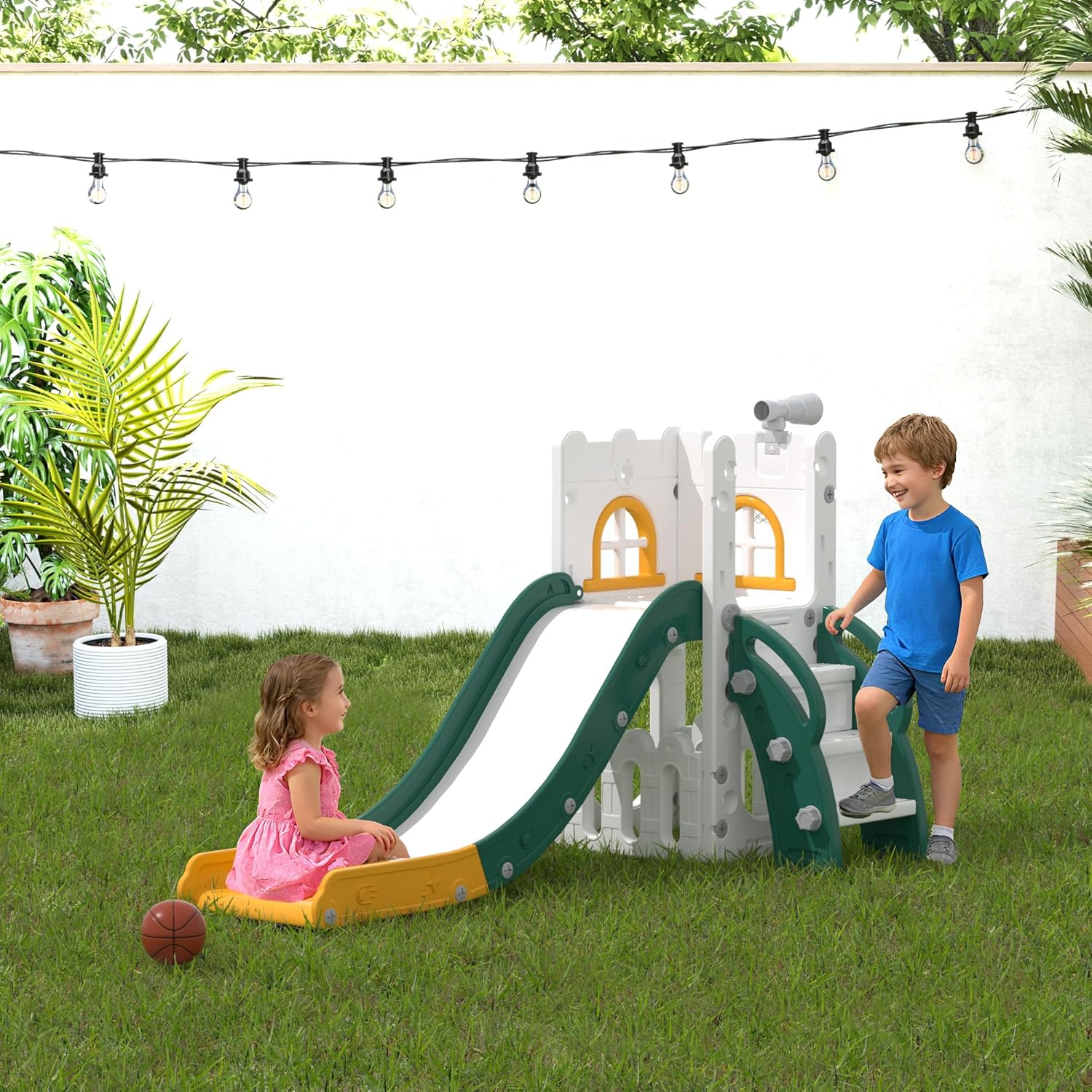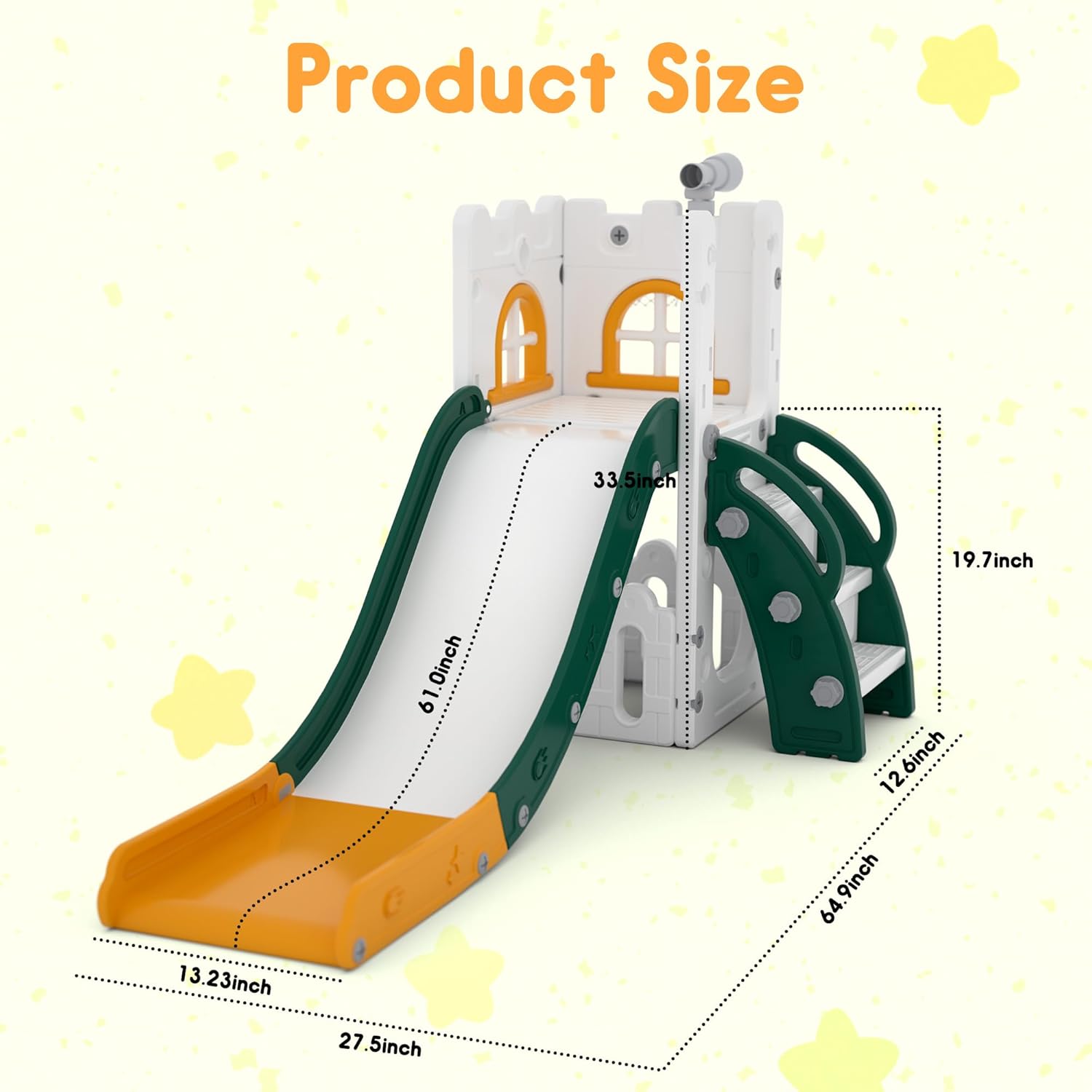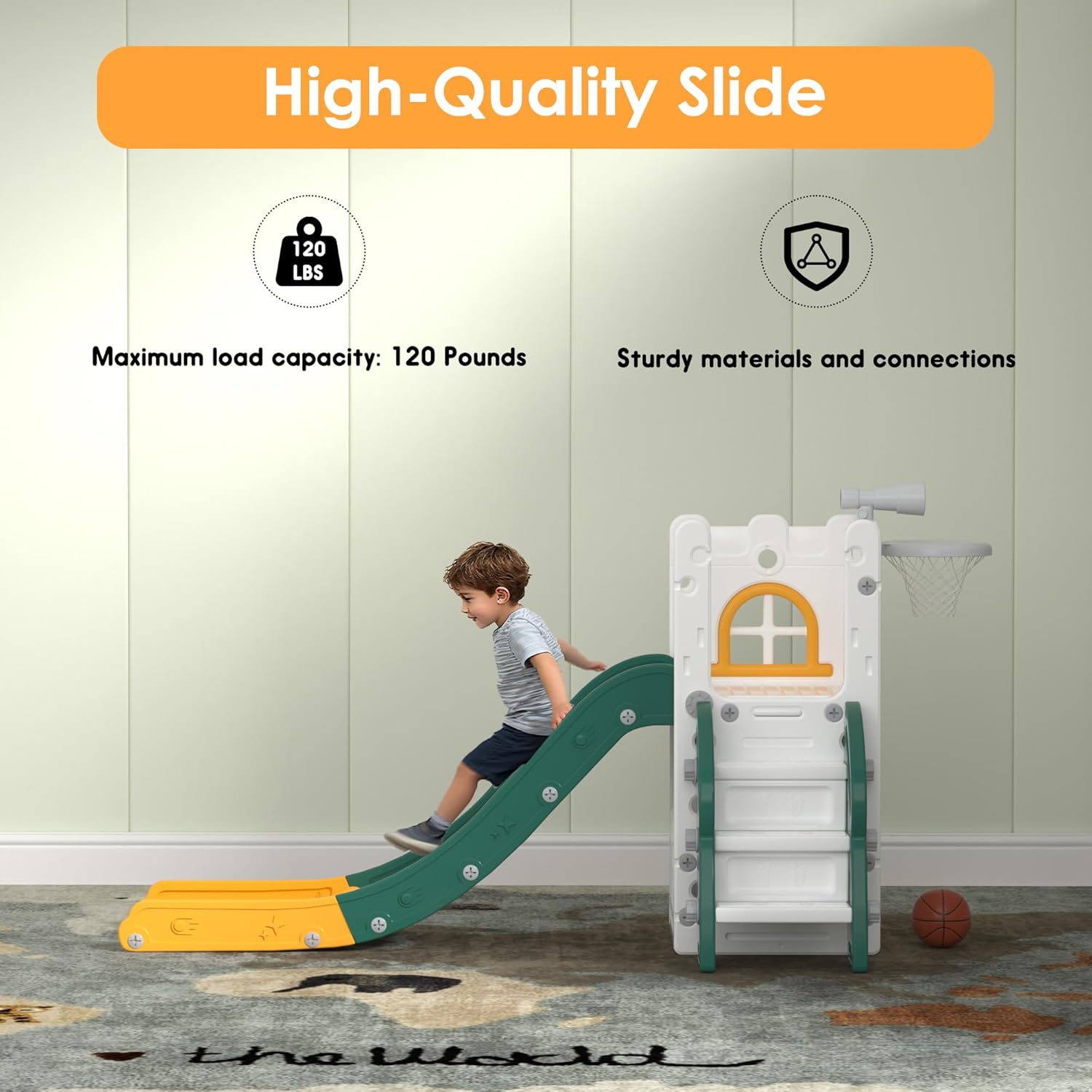 Incluye: Estructura de tobogan, aro, telescopio y compartimiento de almacenaje.