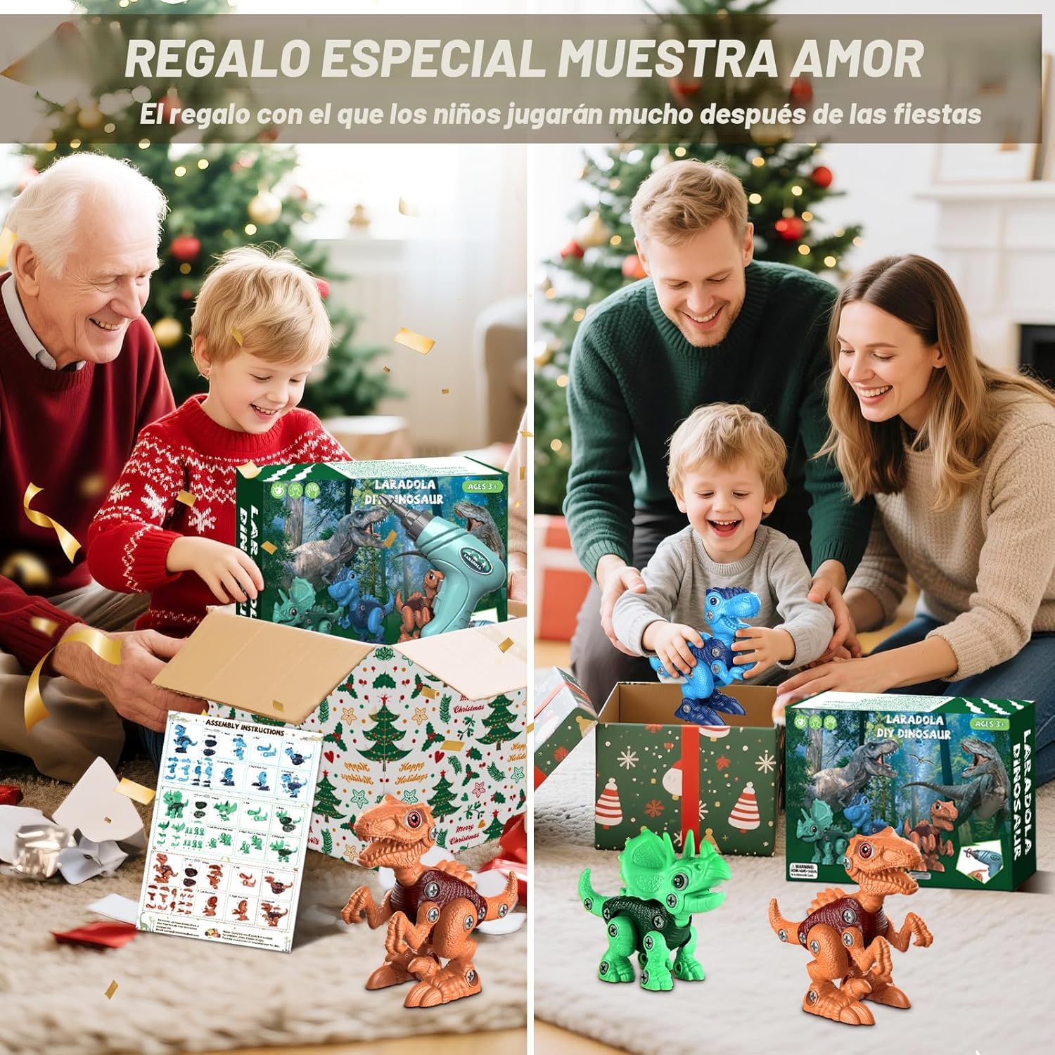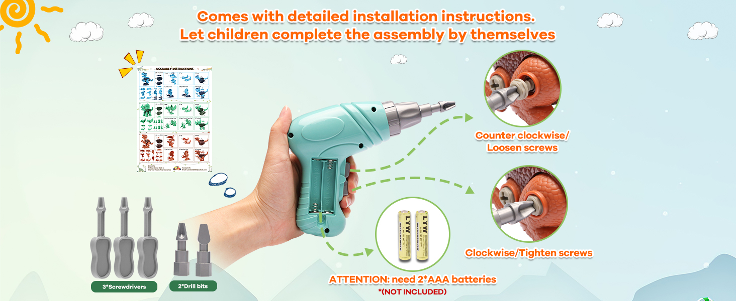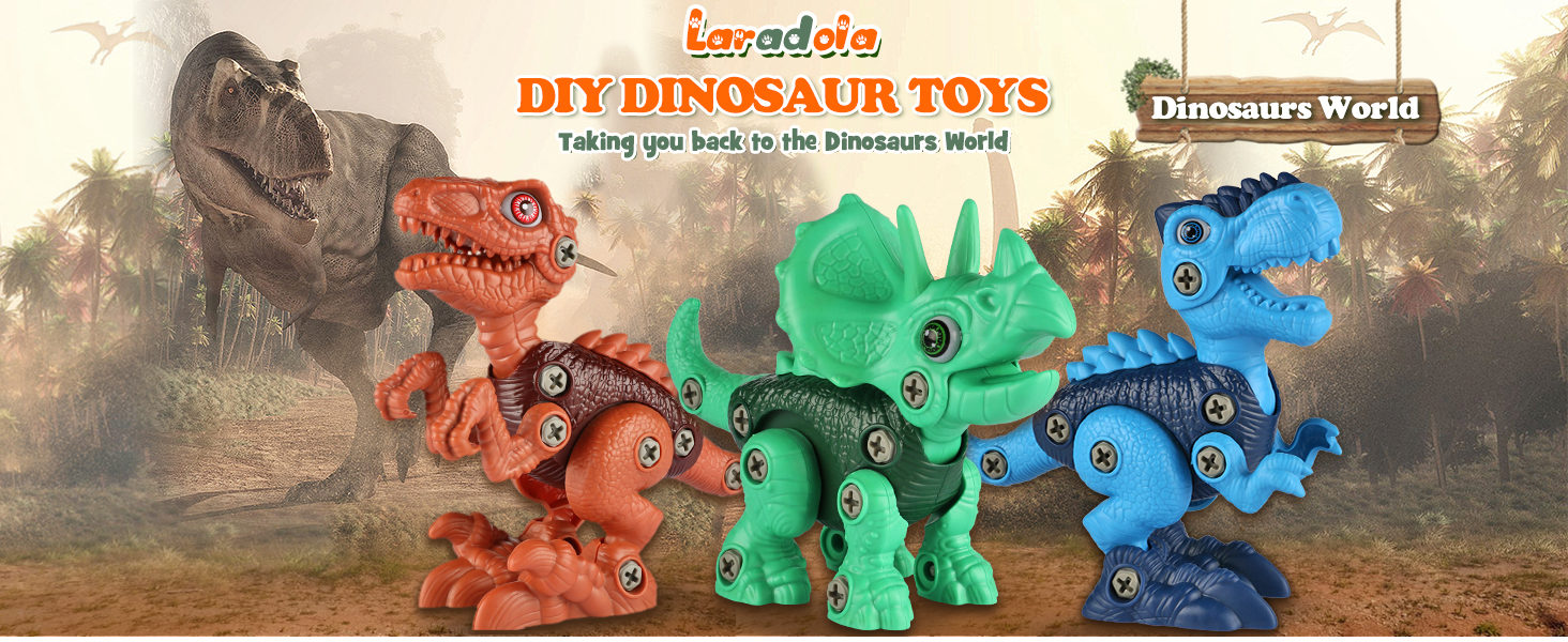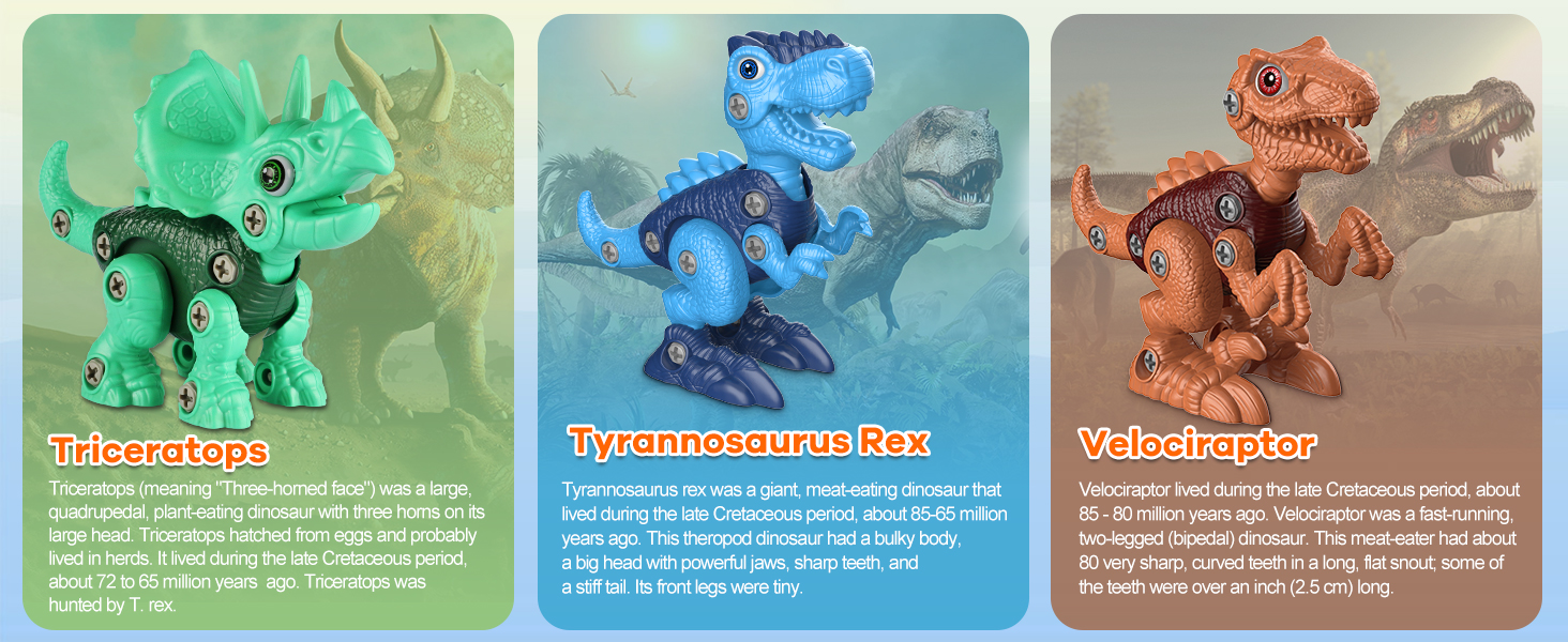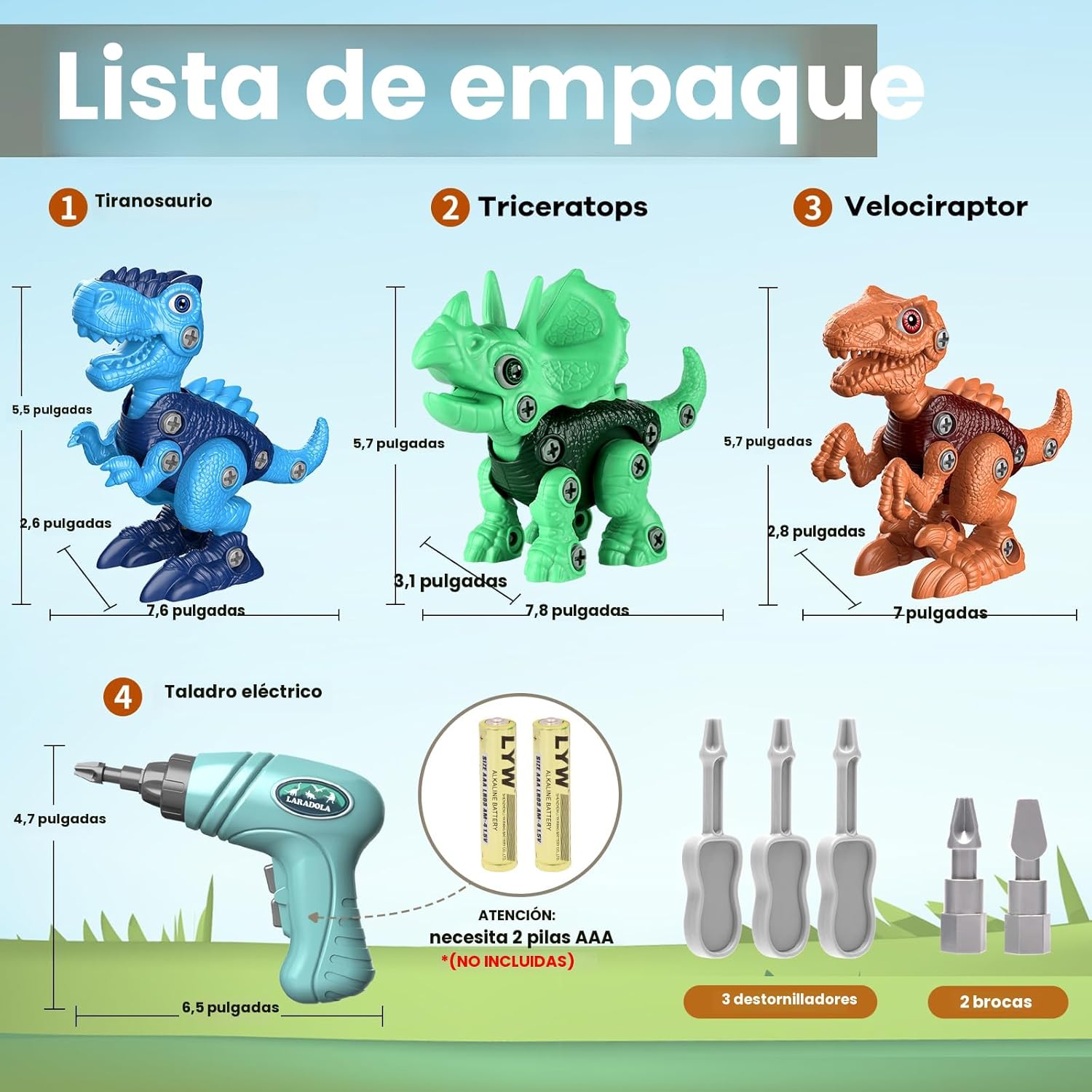 Incluye: 3 Dinosaurios desarmables, 1 Taladro Electrico (Baterias no incluidas), destornilladores manuales y tornillos extra.