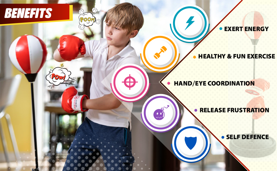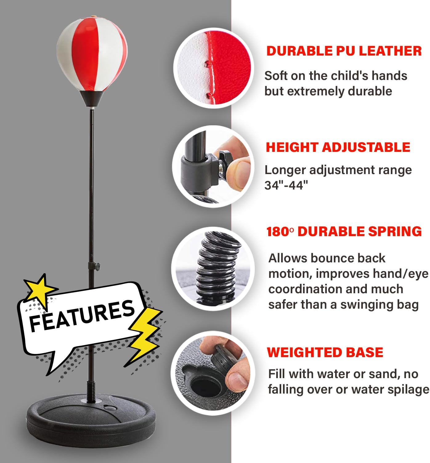 Introduce a tus hijos al mundo del deporte con este Set de Boxeo Bullseye Profesional. Diseñado especificamente para niños, este saco de boxeo de pie es resistente, seguro y rebota despues de cada golpe, garantizando horas de diversion ininterrumpida. A diferencia de los sacos colgados que requieren taladrar el techo, este modelo con base es portatil y facil de instalar en cualquier lugar de la casa.