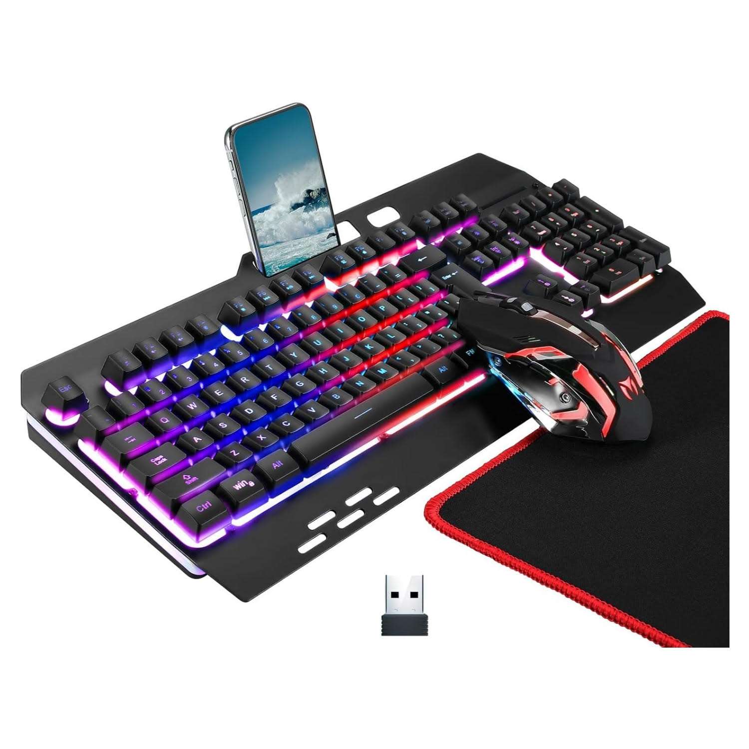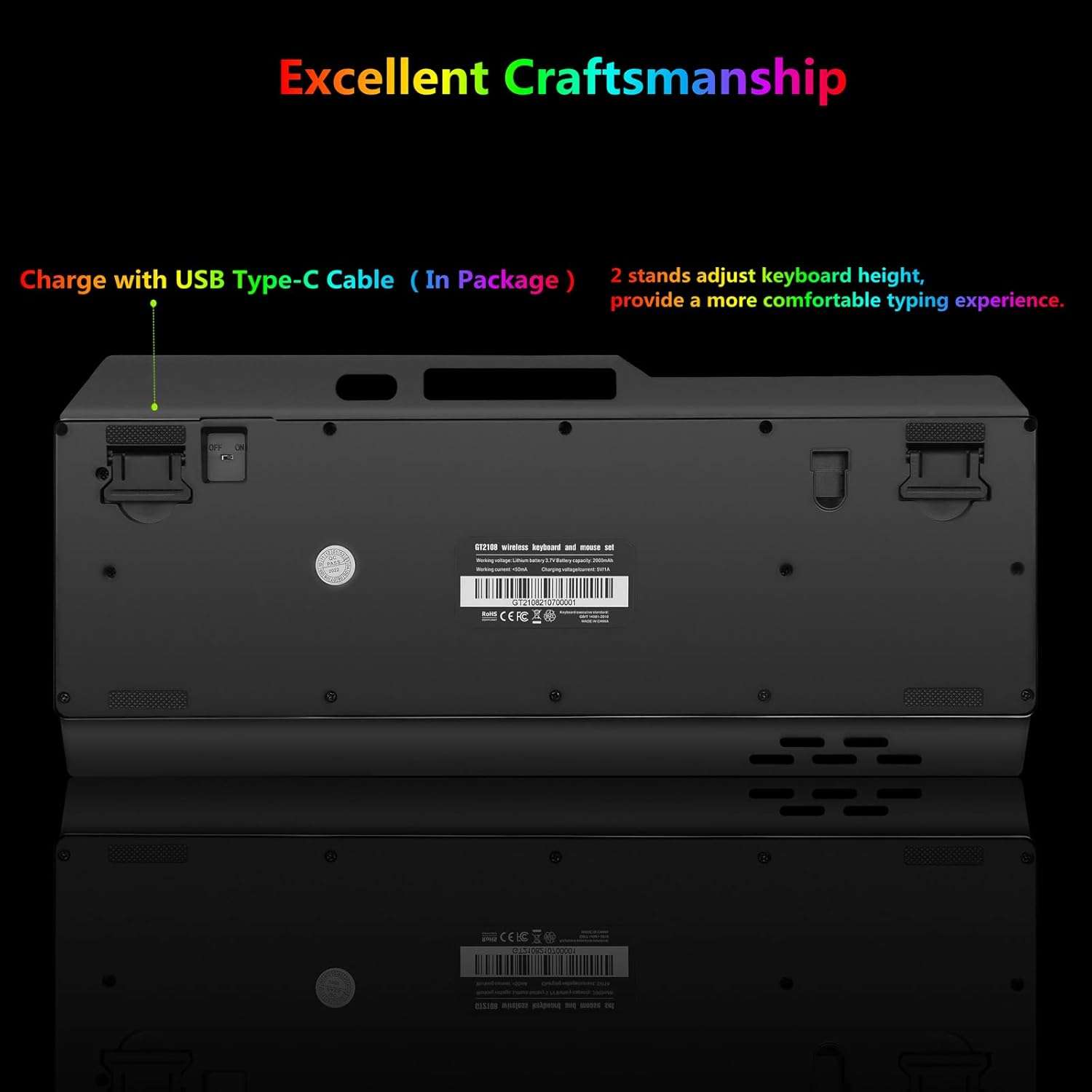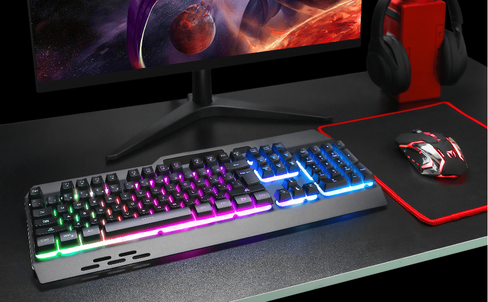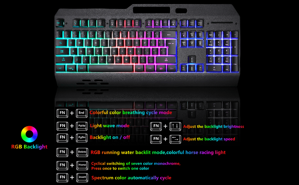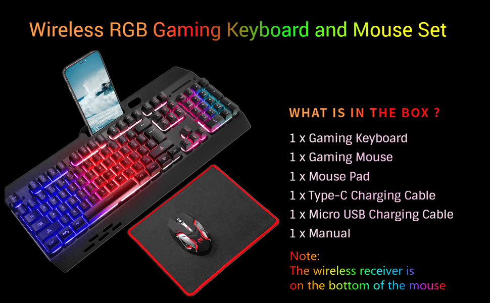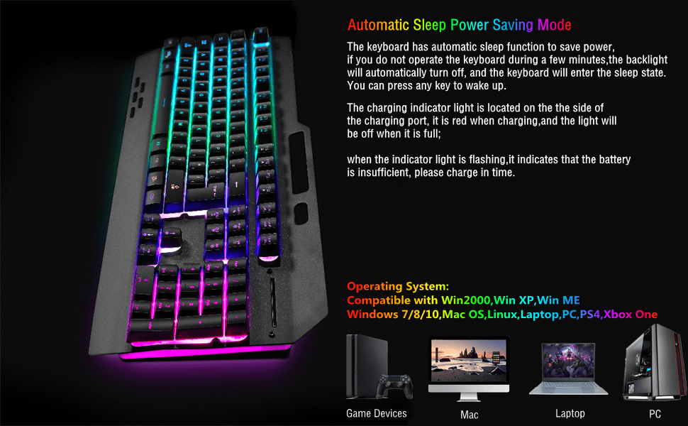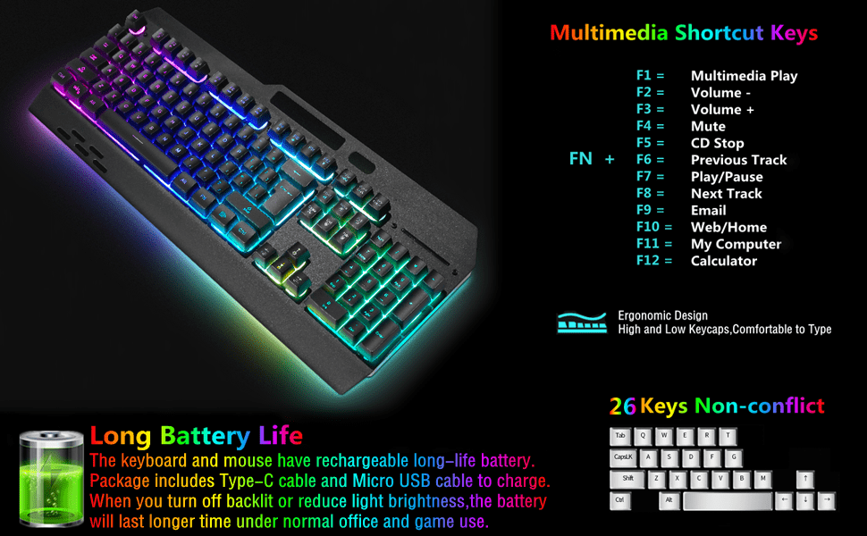 El teclado inalambrico rgb esta fabricado con un panel de plastico y metal que es resistente duradero a prueba de polvo y totalmente resistente al agua Cuenta con una bateria incorporada de gran capacidad y funcion de suspension automatica para ahorrar energia apagando la iluminacion tras unos minutos de inactividad Su diseño incluye veintiseis teclas sin conflicto doce teclas multimedia y un practico soporte para colocar su telefono movil ademas de contar con un reposamanos y dos soportes traseros para ajustar la altura y mejorar la experiencia de escritura