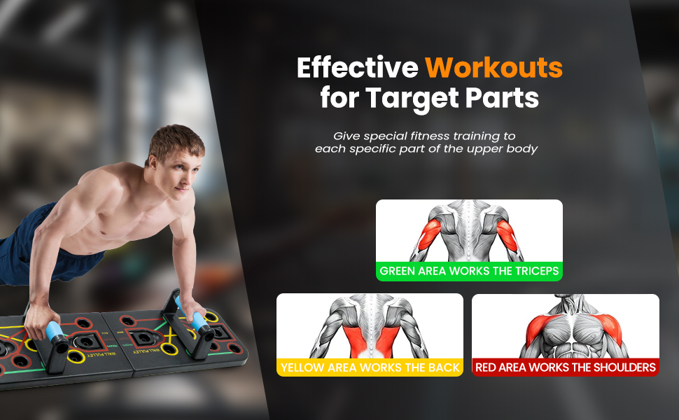 Guia Muscular: Cambia la posicion de las manillas segun el color para atacar diferentes zonas: Pecho, Hombros, Espalda y Triceps.